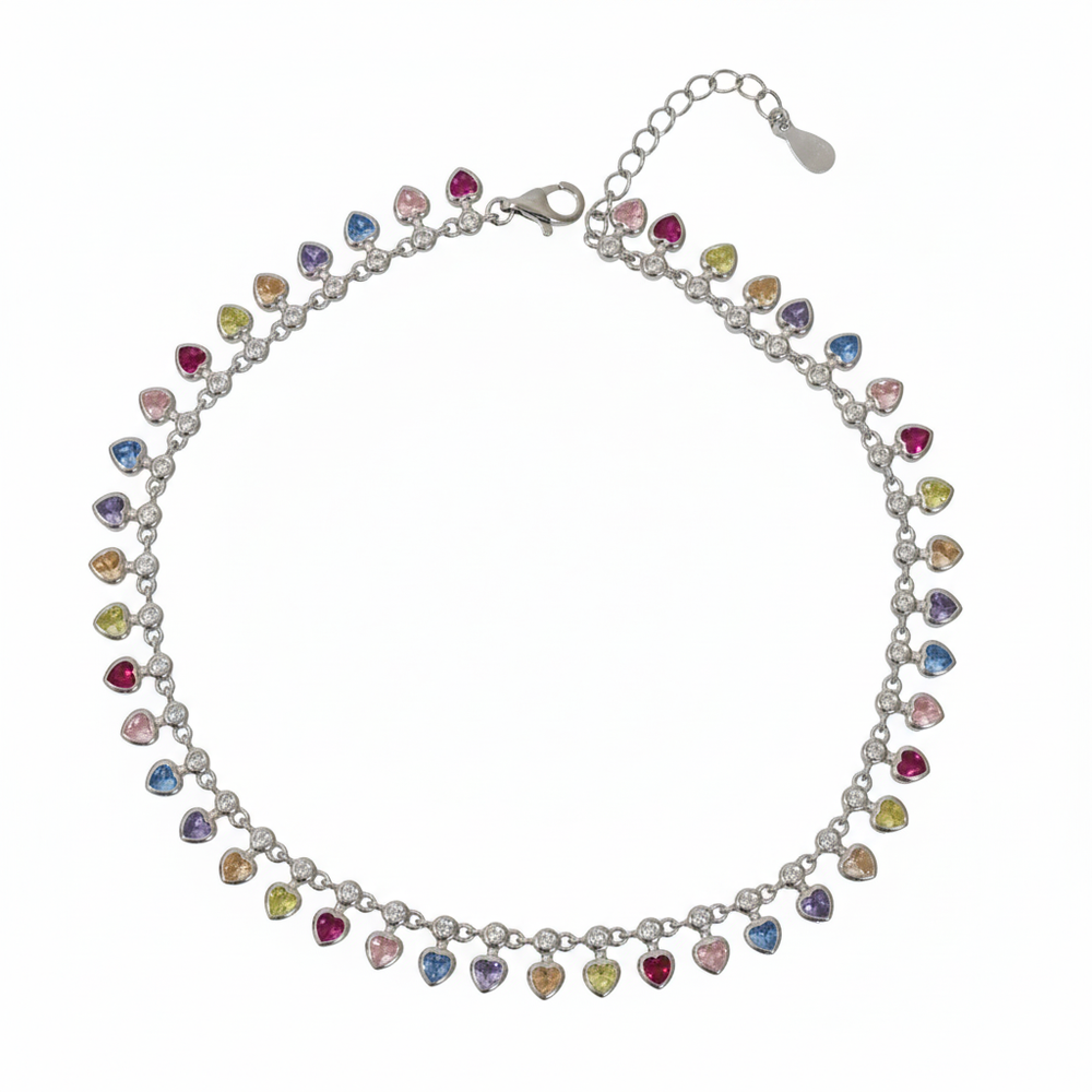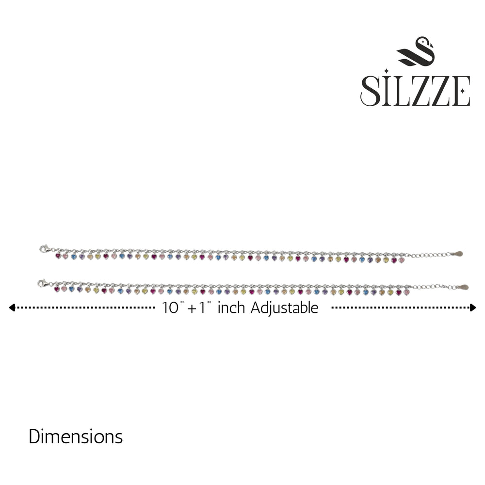 Celebrate color and light with this stunning set of two 925 Sterling Silver anklets, featuring vibrant, dangling Heart-cut color stones showcasing a dazzling array of rainbow-colored Heart-cut CZ stones. The modern, playful design creates a continuous fringe of brilliant color and sparkle, offering a sophisticated take on a fun, trendy style. These anklets will create an absolutely stunning, show-stopping shimmer around the ankle, catching every ray of light with their multi-colored brilliance. Best for any wedding Occasions making you look unique and gorgeous!