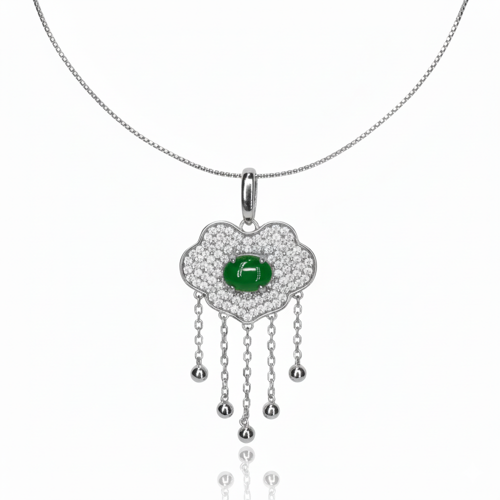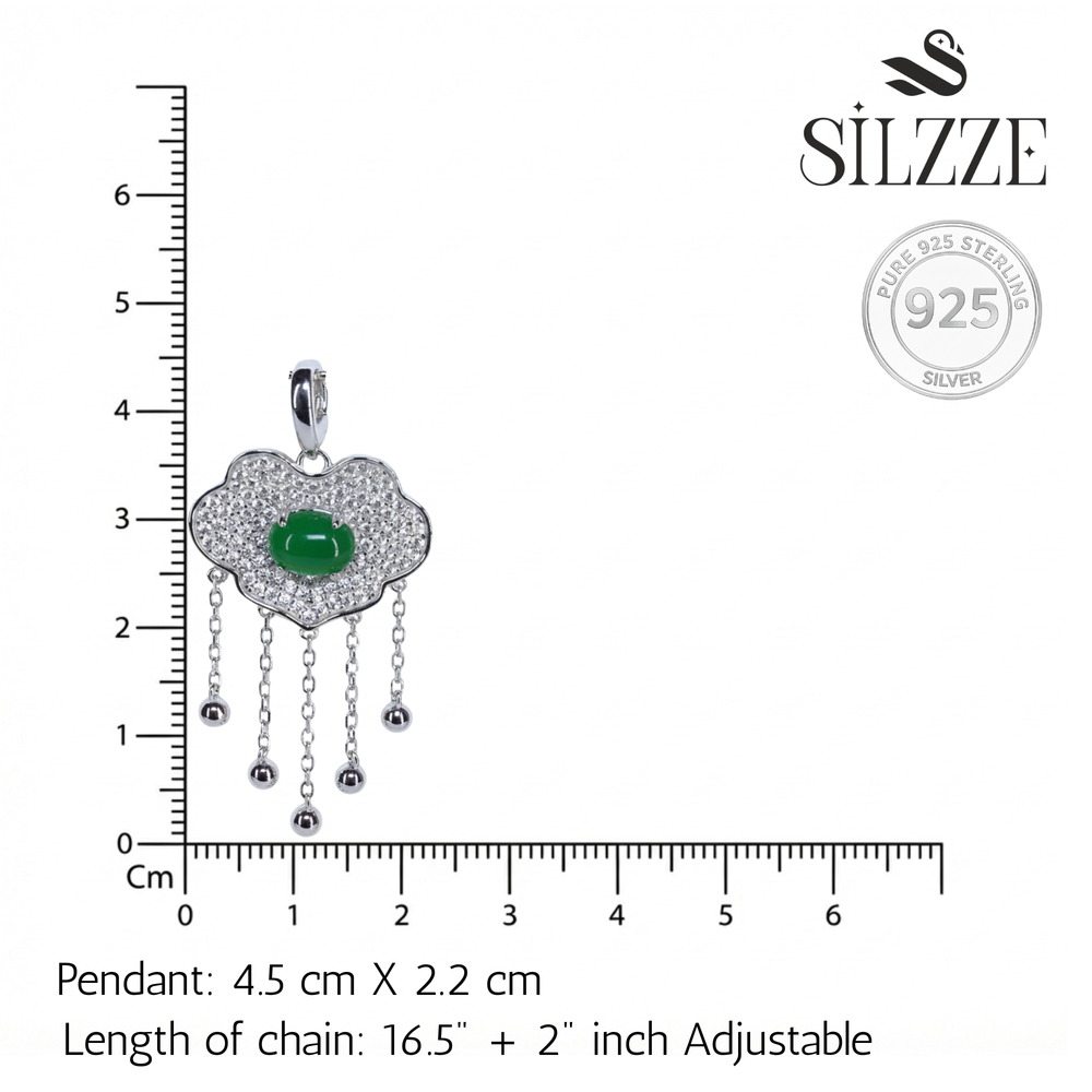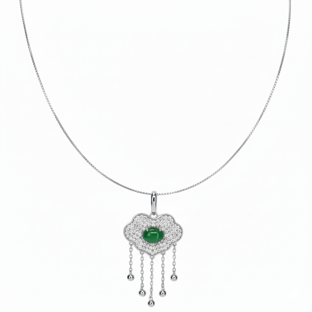 Add a touch of vibrant color and whimsical movement to your look with this captivating charm pendant. This necklace features a smooth, domed Green stone centrally set within a unique, organically shaped pendant. This stylish piece is beautifully crafted in genuine 925 Sterling Silver and hangs from a delicate omega chain. It’s a wonderful piece of statement jewelry that symbolizes good luck and fortune.