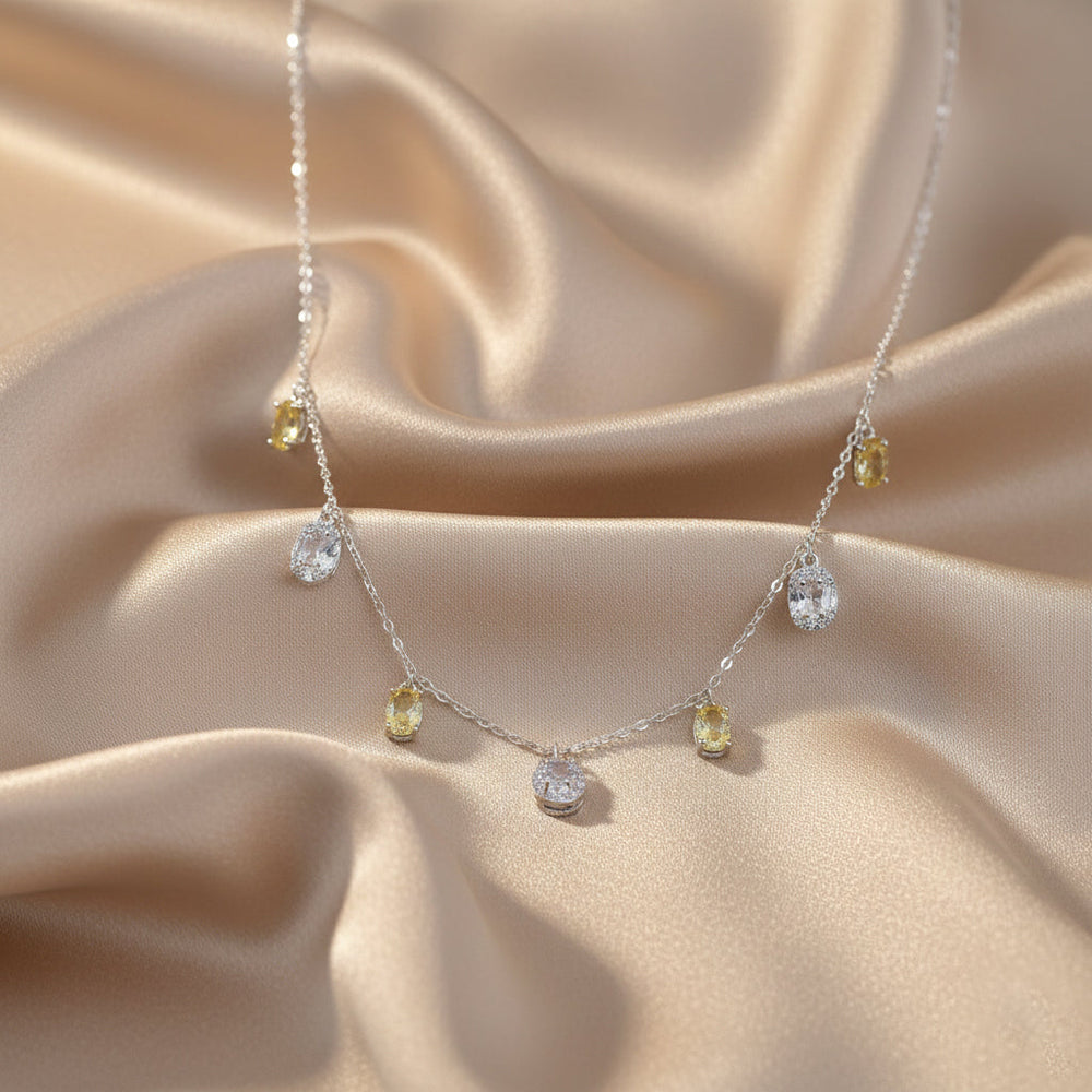 Introducing the epitome of delicate luxury, this 925 Sterling Silver Station Necklace showcases seven stunning oval-cut cubic zirconia drop pendants, alternating between brilliant white and sunny canary yellow. It’s a versatile piece designed for subtle glamour.The uniform oval shapes and scattered placement create an elegant, shimmering necklace that rests like a delicate garland along the collarbone. It will look absolutely radiant on the customer, providing a soft wash of color and sparkle that beautifully illuminates the face and enhances both formal and casual ensembles.