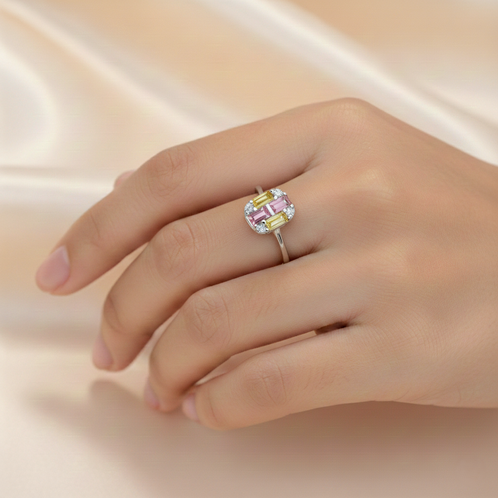 This chic ring features a modern mosaic of pink and yellow baguette stones arranged in a striking rectangular silhouette, accented by shimmering round borders. Crafted in 925 sterling silver, it offers a lightweight and contemporary look that brings a playful, spring-like energy to your daily style. You’ll love this piece for its unique geometric flair and mood-boosting colors, making it an excellent gift for those who celebrate individuality and modern design.