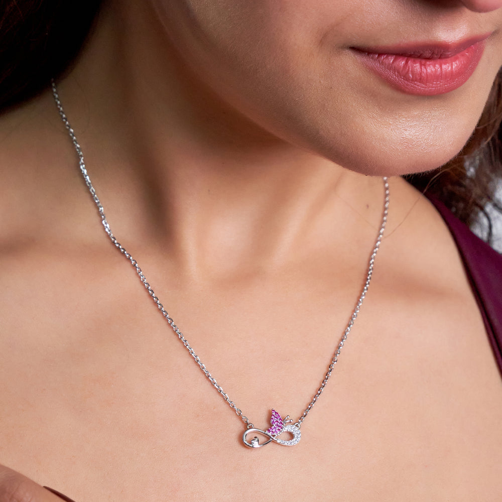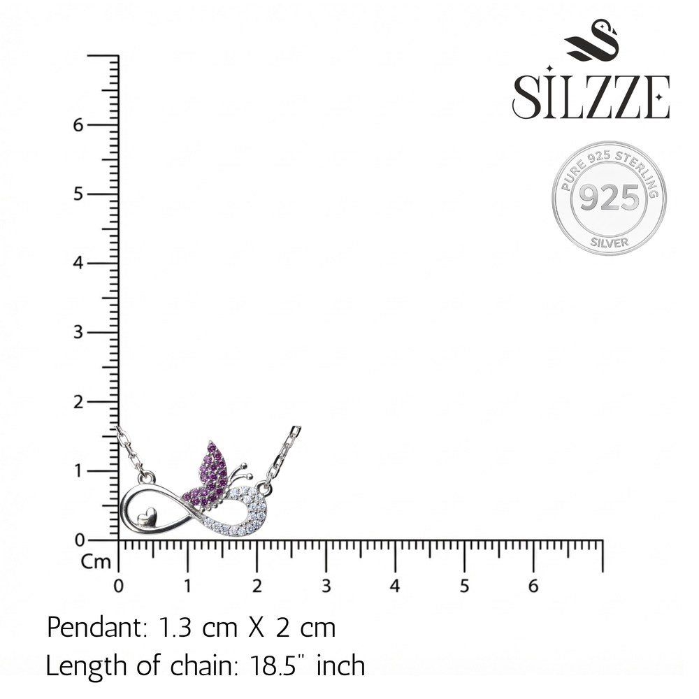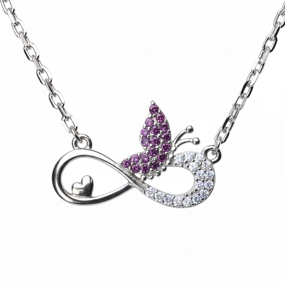 Celebrate a bond that lasts forever with this exquisitely crafted Infinity Butterfly Love Necklace. This deeply symbolic pendant combines three powerful motifs: the infinity symbol representing eternal connection, a delicate heart nestled within the curve signifying love, and a glittering butterfly symbolizing transformation and hope. This piece is made from high-quality 925 Sterling Silver, ensuring lasting brilliance and shine. This meaningful necklace serves as a perfect gift for her, whether for a daughter, sister, or significant other, and makes an ideal purchase for occasions like birthdays, anniversaries, or Mother's Day.