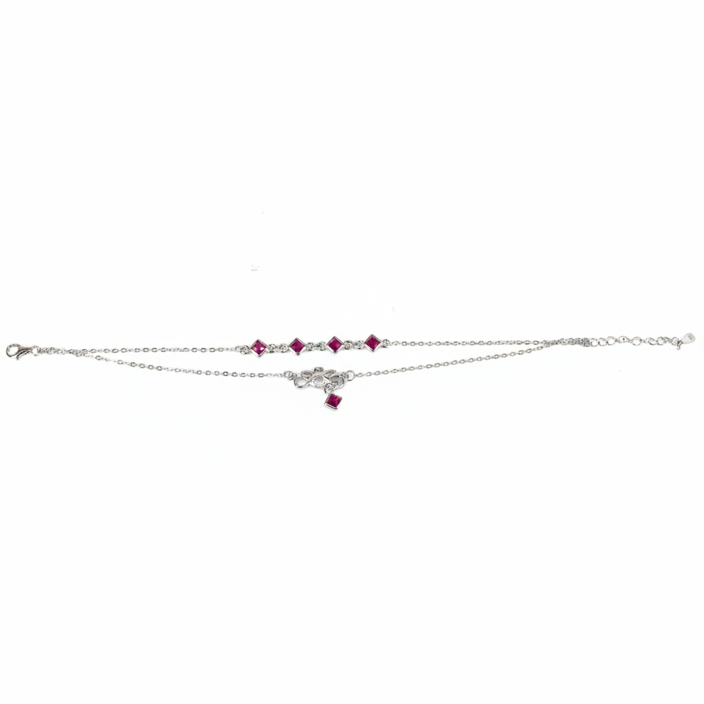 This elegant statement bracelet is made from premium 925 Sterling Silver, the top layer showcases five striking square-cut Ruby- Pink Cubic Zirconia stones, beautifully contrasted by a dangling infinity knot charm on the bottom layer. The vibrant pink stones and delicate infinity design offer a feminine, meaningful touch, perfect for celebrating special occasions, date nights, or festivals like Diwali.