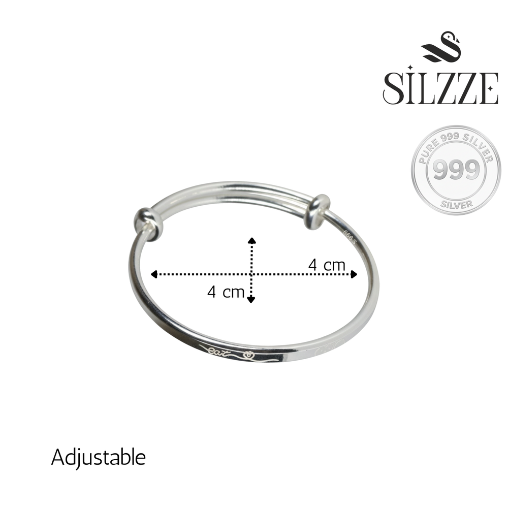 Crafted from the highest purity 999 Fine Silver, this adjustable baby kada set is a timeless heirloom designed for delicate skin. Its unique sliding mechanism allows the kada to be easily resized, ensuring a comfortable and secure fit that grows with the child. This piece offers a classic, gentle sheen that beautifully complements traditional Indian wear as well as modern outfits, making the baby's tiny wrists appear even more adorable. The high-purity silver is auspicious and perfect for gifts, symbolizing prosperity and good health for the little one.