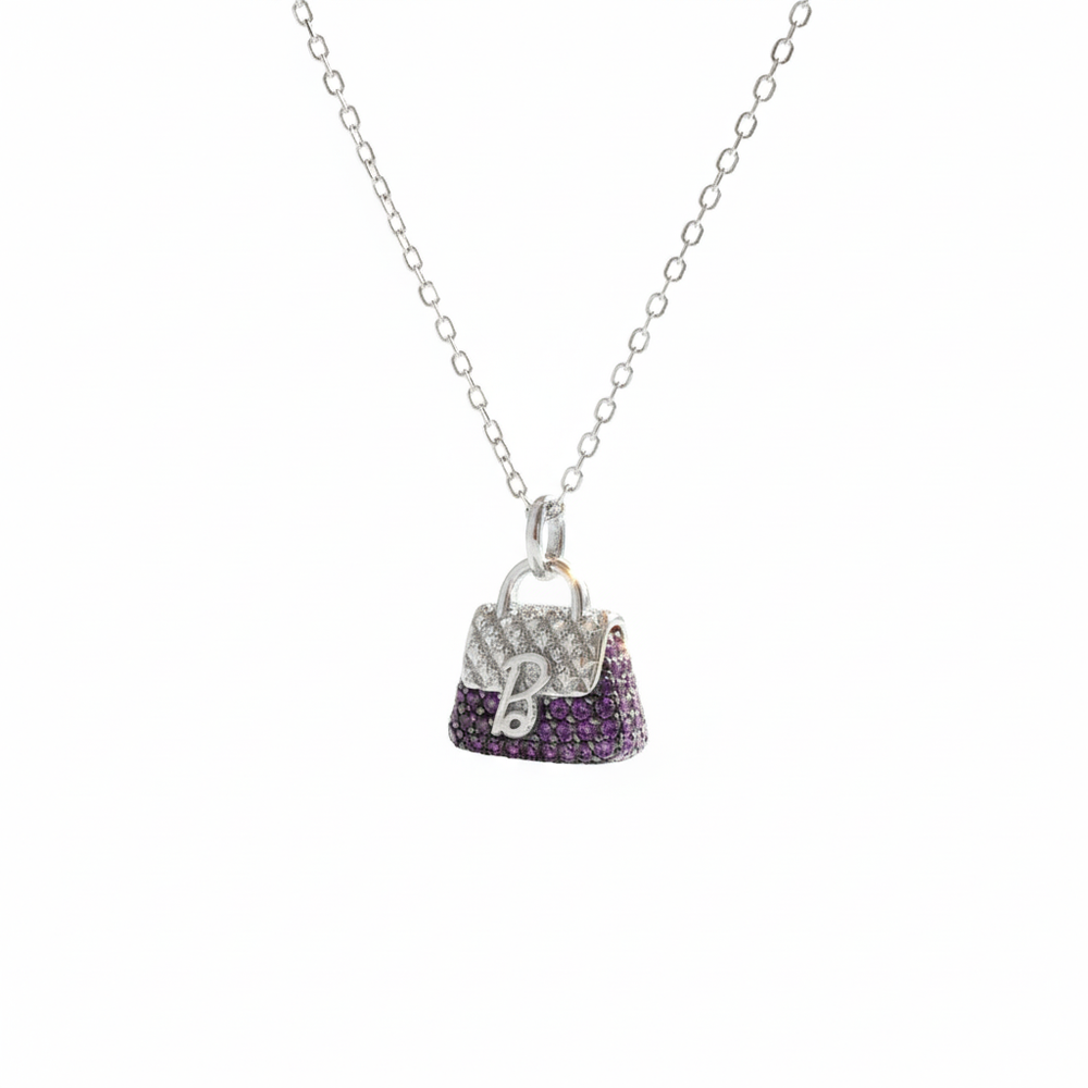 Step out in style with this adorable and dazzling Mini Handbag Charm Necklace. This unique pendant captures the essence of luxury fashion in a petite, wearable form, making it the perfect accessory for any trendsetter. The miniature handbag design is fully encrusted with vibrant purple and white shimmering stones, centered with a chic letter 'B' monogram.