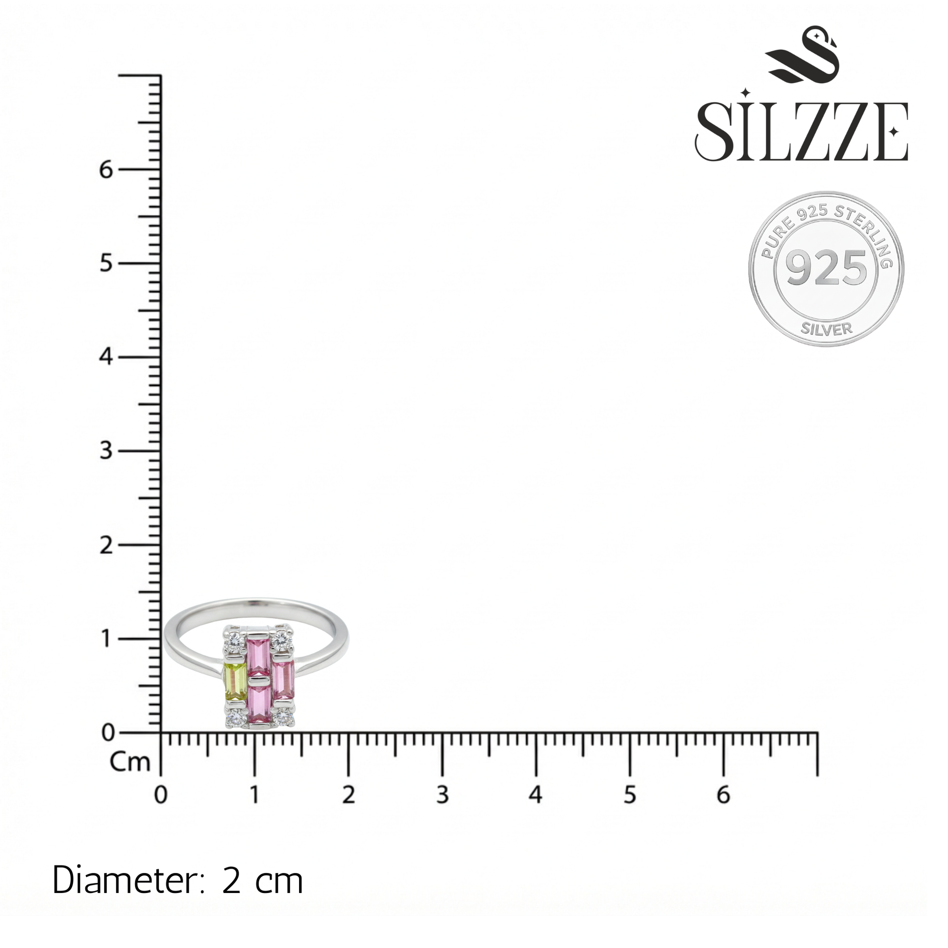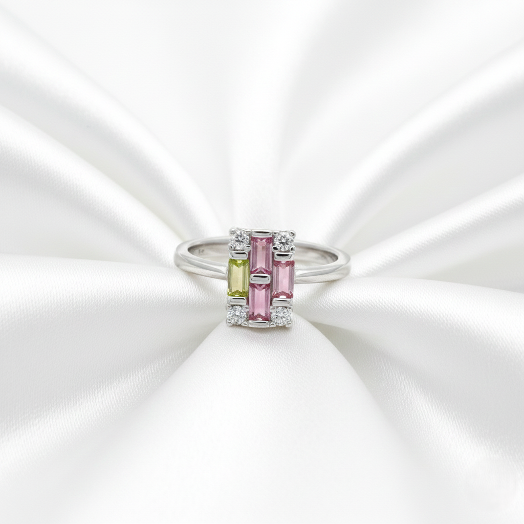 This striking ring showcases a modern architectural design, featuring a mosaic of pink and lime green baguette-cut crystals framed by sparkling round accents. Crafted in 925 Sterling Silver, the sleek, high-shine band perfectly complements the bold pops of color for a contemporary aesthetic.