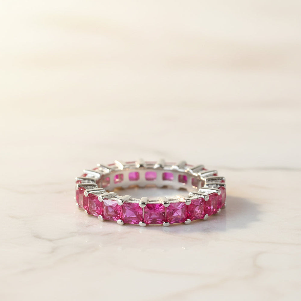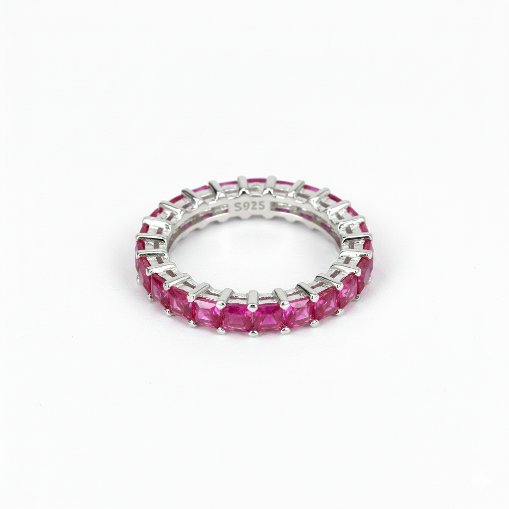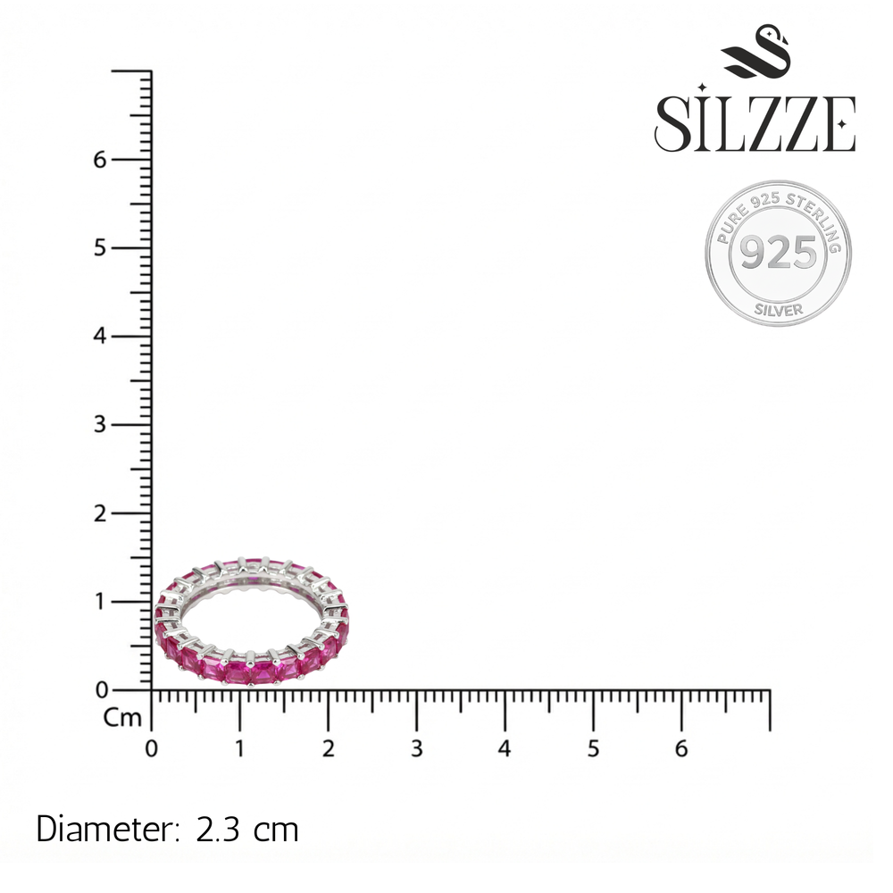 Elevate your daily style with this sophisticated eternity band featuring a continuous row of vibrant crimson and brilliant clear baguette-cut stones. Crafted in 925 Sterling Silver, this ring offers a sleek, prong-set design that ensures a luxurious, high-end look while maintaining a smooth and comfortable fit.