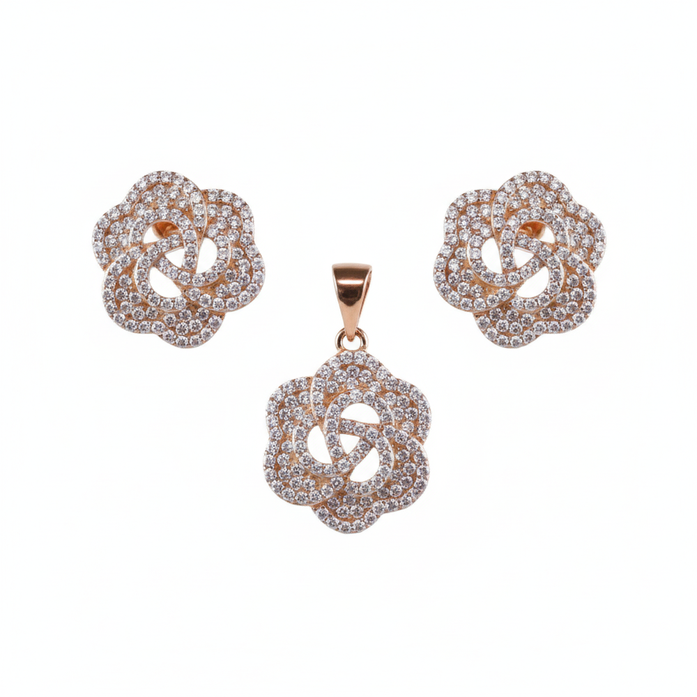 Rose Gold Polished 925 Sterling Silver Jewellery Set, featuring a magnificent Interlocking Rose Knot design. Every curve of the flower is generously studded with sparkling (CZ) stones, radiating luxury and intricate craftsmanship. The warm, fashionable rose gold tone instantly complements Indian skin tones, adding a soft, celebratory glow. The substantial, eye-catching floral design sits beautifully as a statement piece, perfect for festive occasions, weddings, or any evening event where you want to shine brightly.
