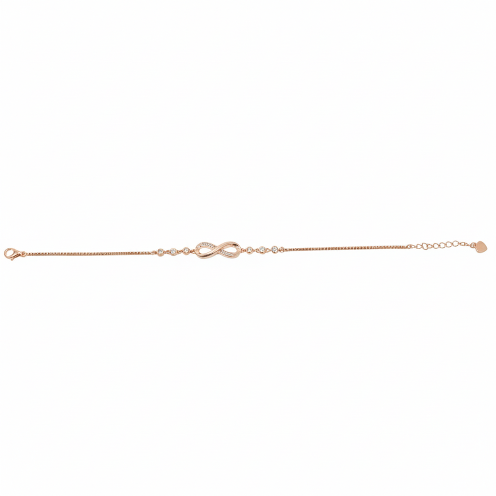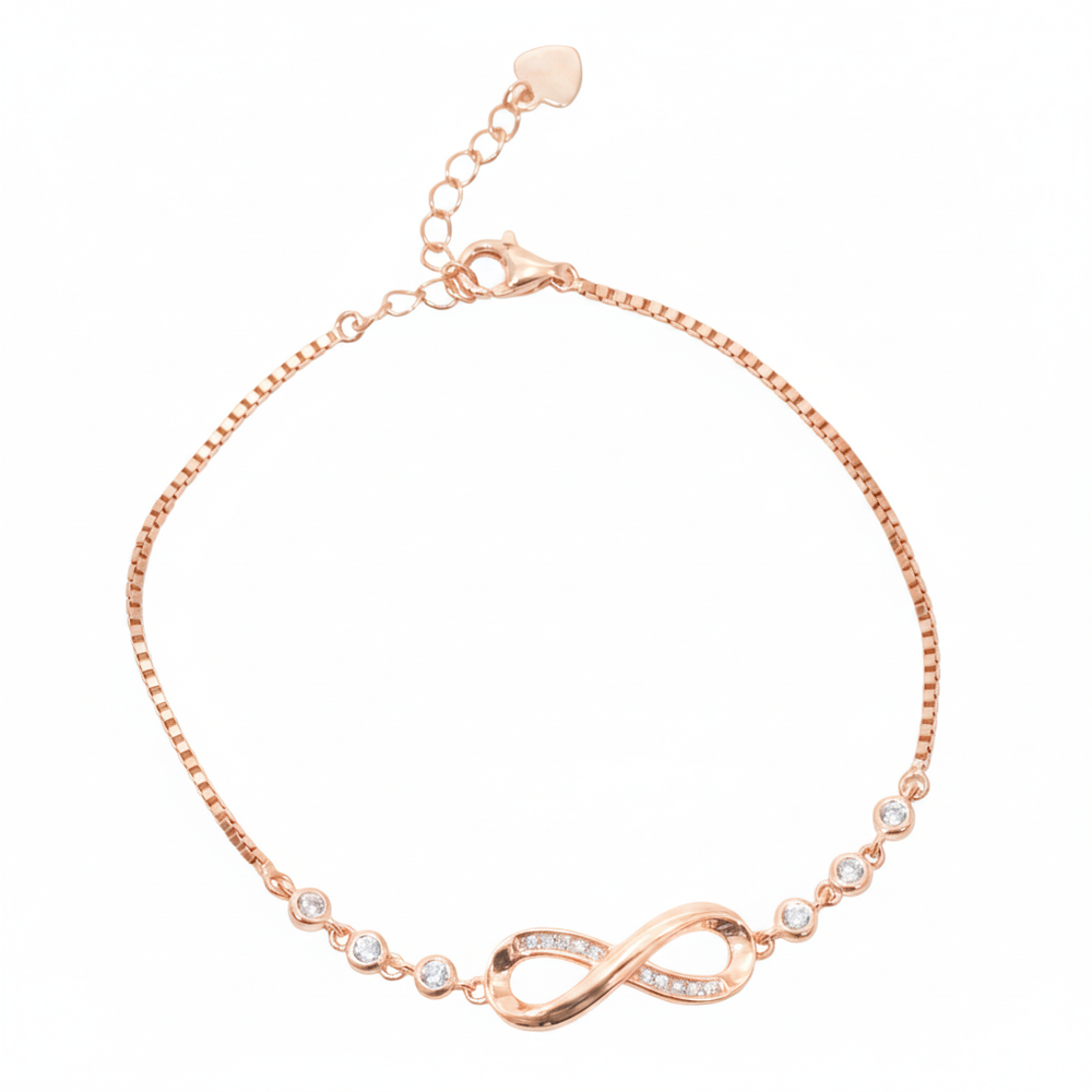 Celebrate eternal connection with our Rose Gold-Plated 925 Silver Infinity Bracelet. Featuring the iconic symbol paved with brilliant cubic zirconia and accented by seven surrounding stones, this piece is a delicate expression of lasting love and devotion. Worn alone or stacked, this bracelet adds a meaningful and sophisticated sparkle to the wrist. The gentle rose gold hue and adjustable length ensure an elegant fit, making it a perfect gift for commemorating special relationships.