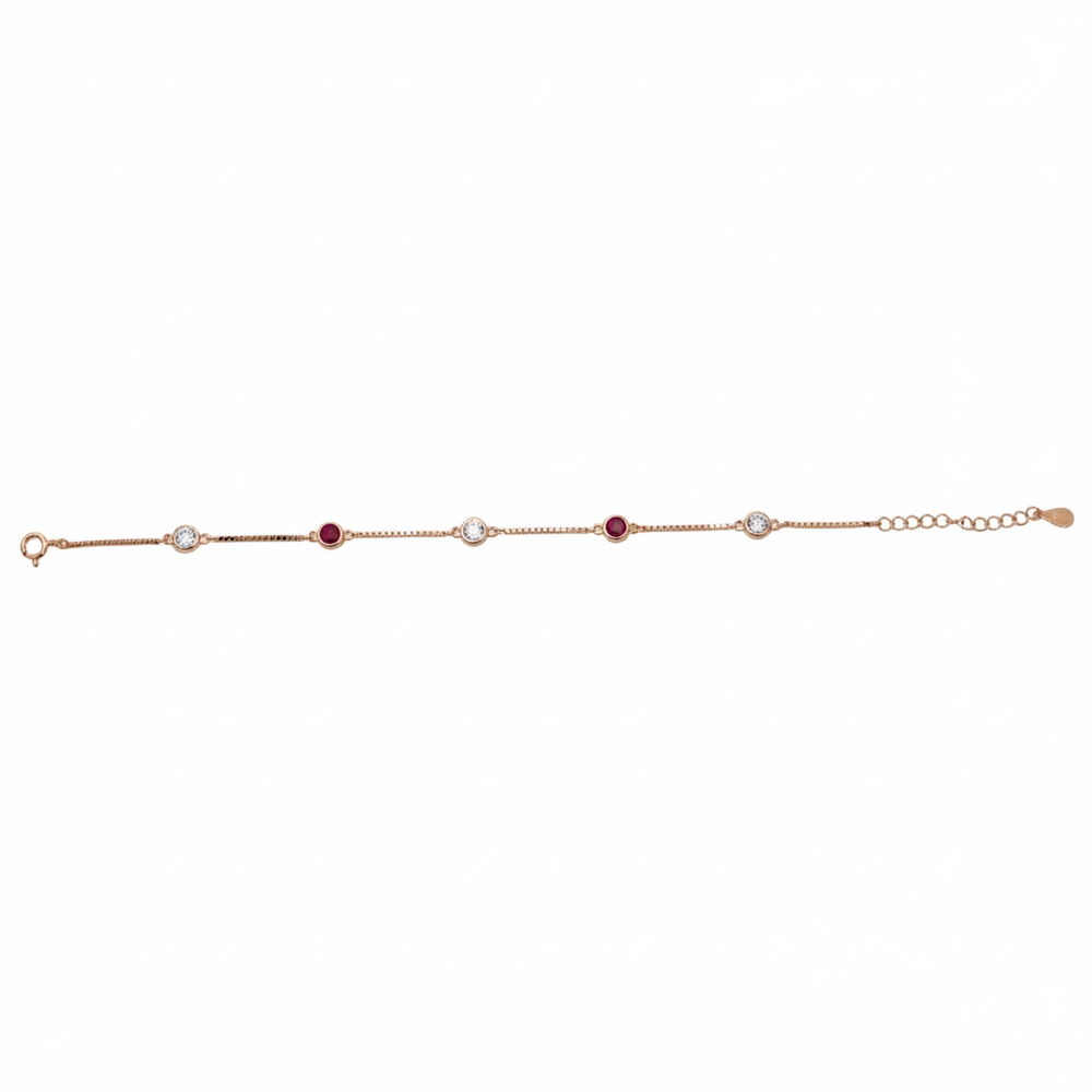Introducing our elegant 925 Sterling Silver Rose Gold Plated Bracelet, featuring a refined box chain linked by five bezel-set gemstone stations. The design alternates between brilliant clear and rich ruby-red cubic zirconia for a beautiful, classic contrast. The warm hue of the rose gold beautifully enhances the depth of the red stones, creating a piece that looks instantly luxurious and refined on the wrist. This subtle yet striking bracelet adds a sophisticated pop of color and effortless sparkle, making it perfect for both daily wear and special occasions.