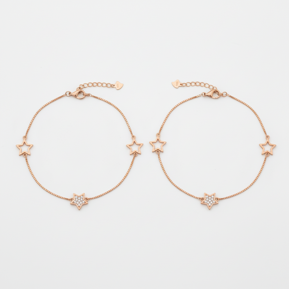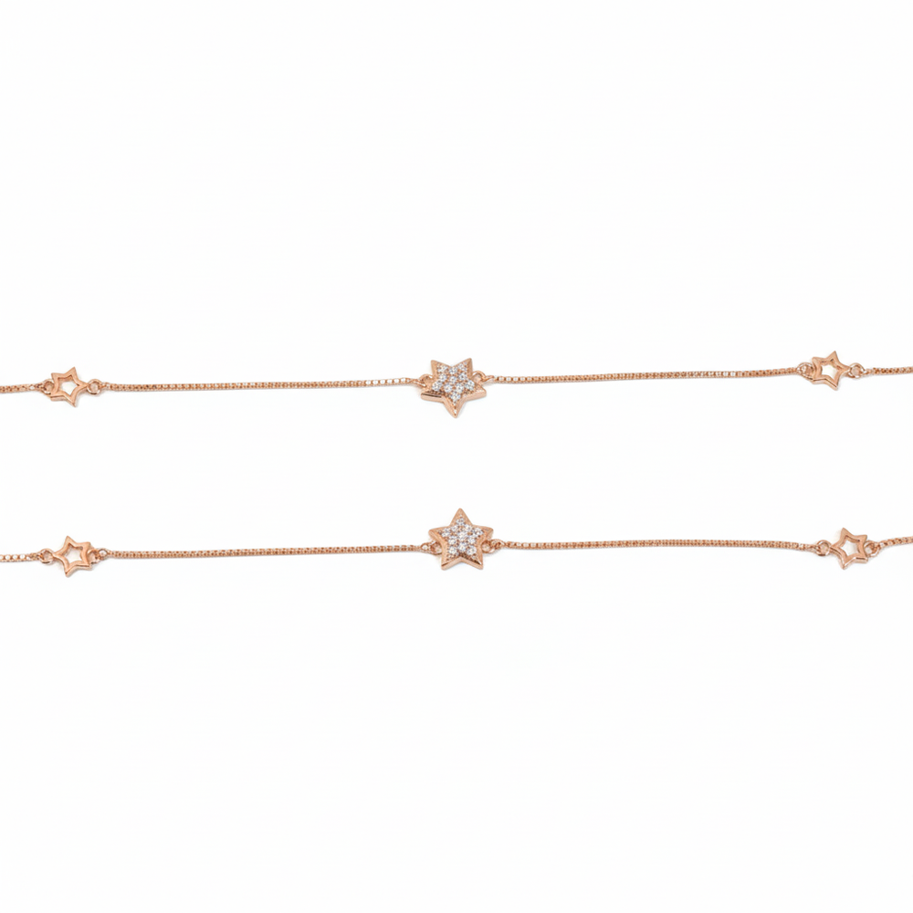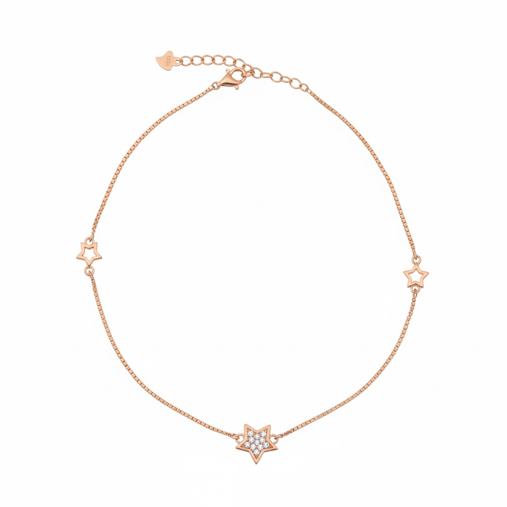 Crafted from 925 Sterling Silver and richly plated in warm rose gold. This stunning anklet features a delicate, sleek box chain that suspends three charming star motifs. The warm rose gold hue will beautifully complement every skin tone, giving the ankle a delicate, sun-kissed radiance and a soft, feminine glow. Perfect for everyday wear.