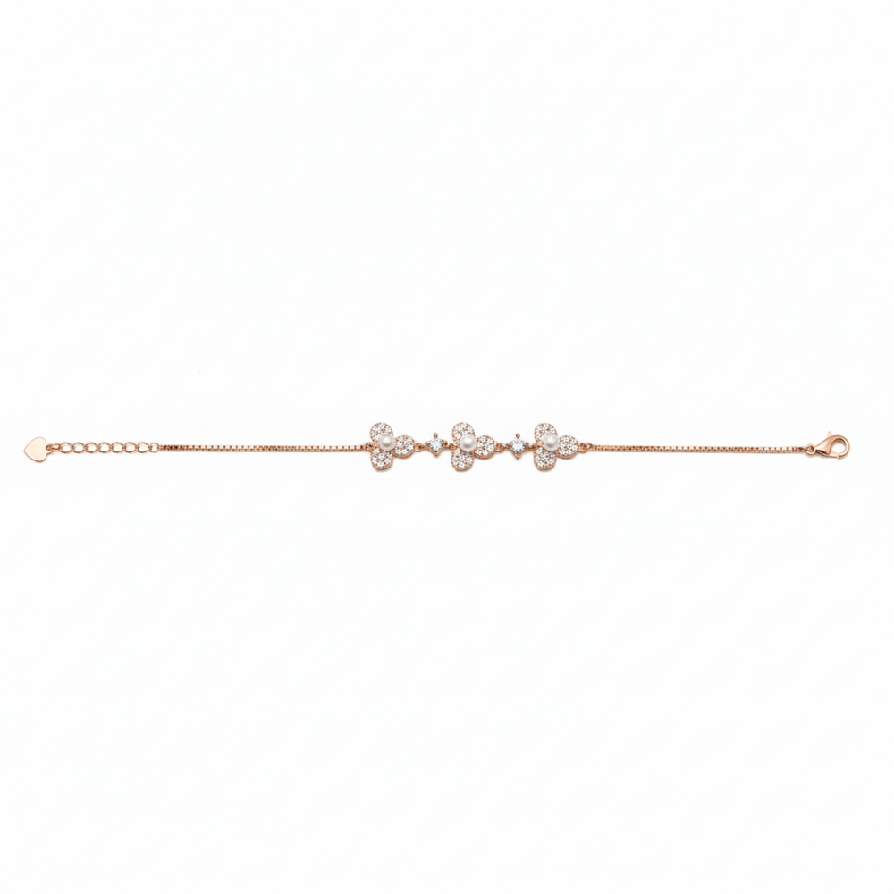 Crafted from genuine 925 Sterling Silver , It features three exquisite floral clusters, each detailed with dazzling pave-set Cubic Zirconia (CZ) stones and a luminous pearl center. The rose gold setting and pearl accents provide a vintage-inspired romance, giving your wrist a soft, glamorous glow that is both refined and eye-catching. The intricate sparkle of the CZ stones combined with the soft sheen of the pearls makes it an ideal piece for special occasions, from engagement parties to festive family gatherings.