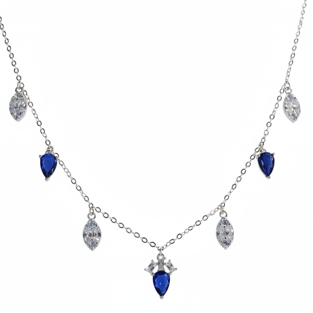 Embrace classic elegance with this stunning station necklace, a sophisticated centerpiece designed to drape gracefully along your collarbone. This exquisite piece features a harmonious arrangement of deep Royal Blue and brilliant clear gemstones, creating a mesmerizing sparkle that echoes timeless glamour. Crafted in 925 Sterling Silver, this piece combines enduring quality with a luxurious aesthetic, making it the perfect sapphire blue statement necklace for special occasions or a distinctive addition to your everyday fine jewelry collection. Its versatile design and captivating color make it an ideal gift for her, securing its place as a cherished item.