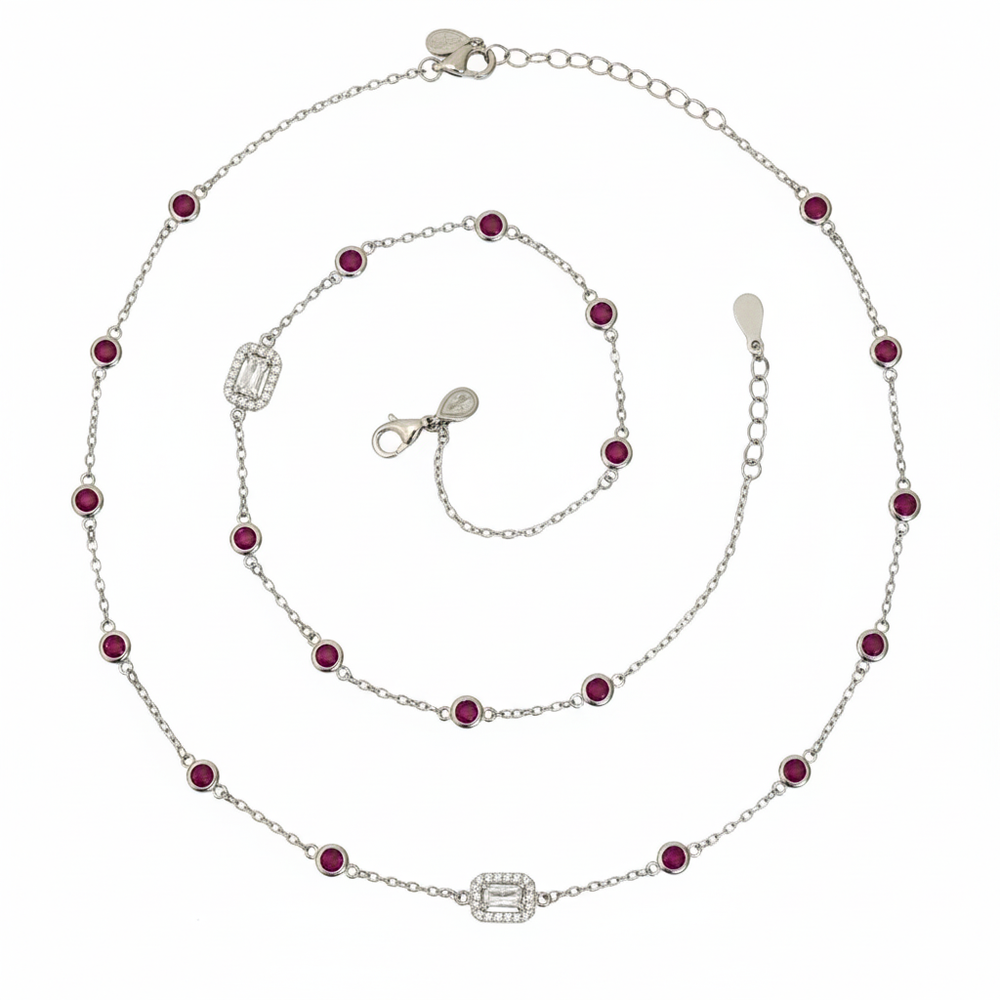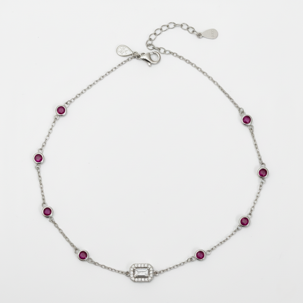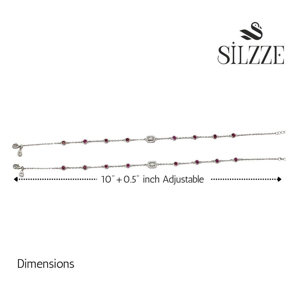 This Elegant 925 Sterling Silver Anklet features a classic chain which has bezel-set ruby red stones and a dazzling central baguette-cut CZ stones . It is secured by an adjustable lock, offering a vibrant and elegant fit. The deep red color provides a dramatic and rich contrast against the skin, adding a refined pop of color and luxury to your look , making it a sophisticated choice for formal events or enhancing date-night attire.