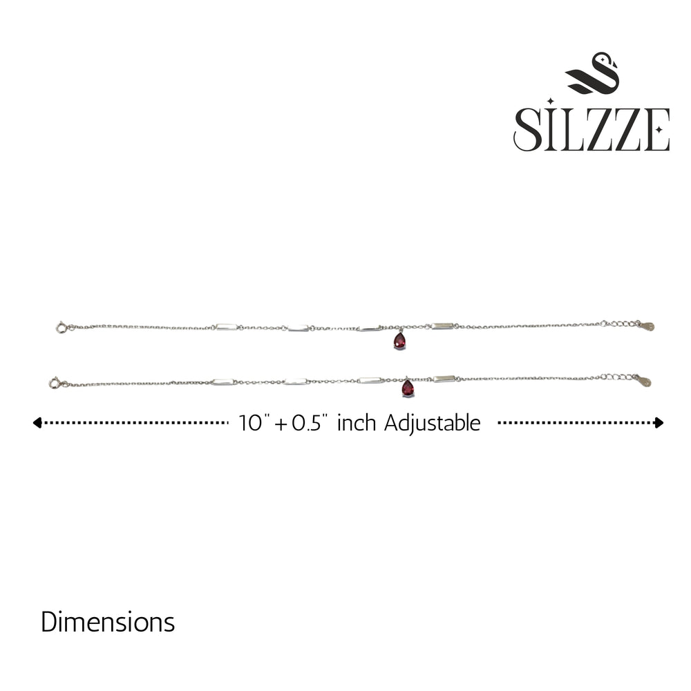 This fine 925 silver chain anklet features contemporary accents: polished silver bar links, interspersed along the chain, giving the piece a chic, structural feel. A vibrant ruby colored CZ dangles delicately, adding a luxurious focal point and a beautiful contrast to the silver.