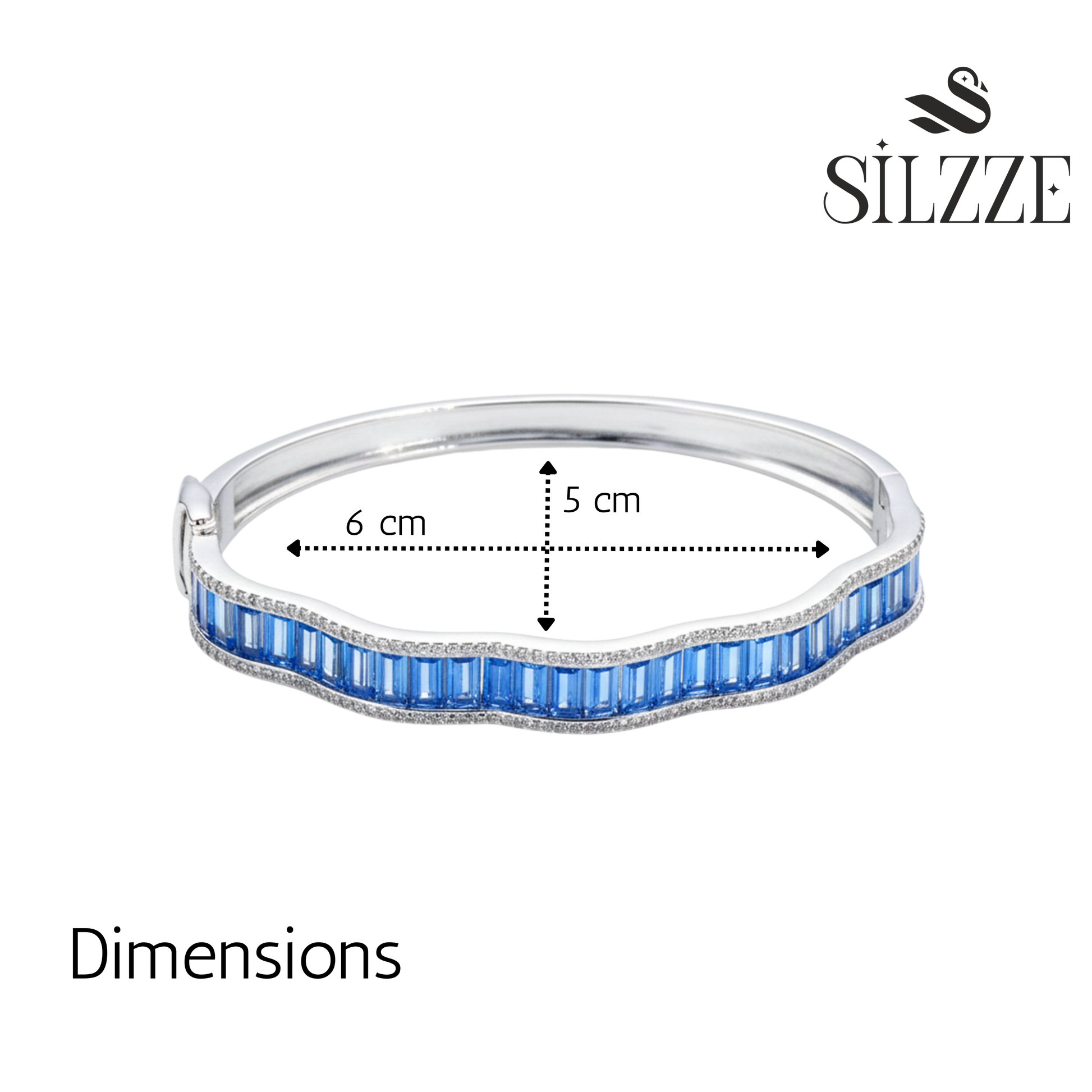 Capture the depth and beauty of the ocean with our exquisite Ocean Sparkle Baguette Bangle. This breathtaking piece features a mesmerizing channel of rich sapphire blue cubic zirconia (CZ) stones, precision-cut into sleek baguette shapes. The vibrant blue color is reminiscent of high-grade sapphires, offering a look of true luxury. Set in a polished, durable silver-tone casing and featuring a secure hinged clasp, this bracelet is designed for comfortable wear and long-lasting shine