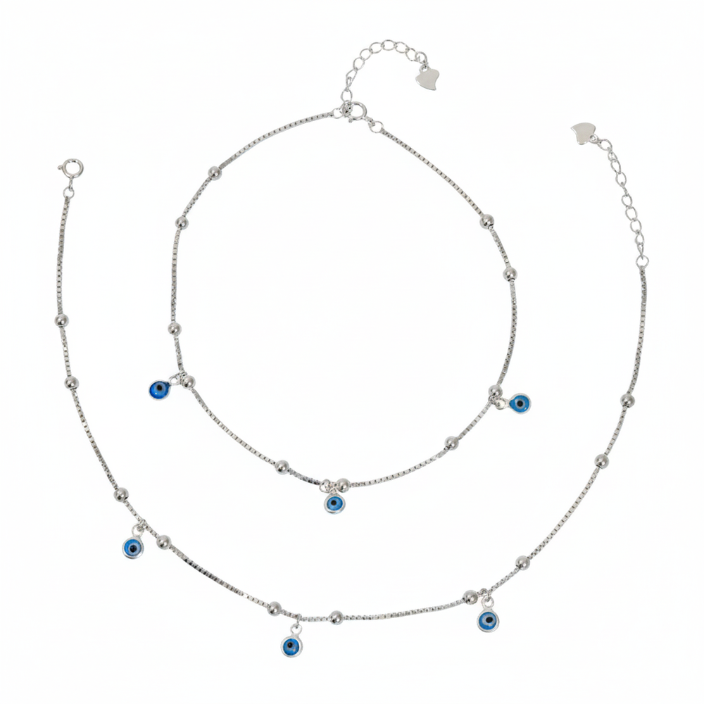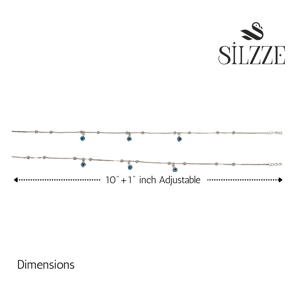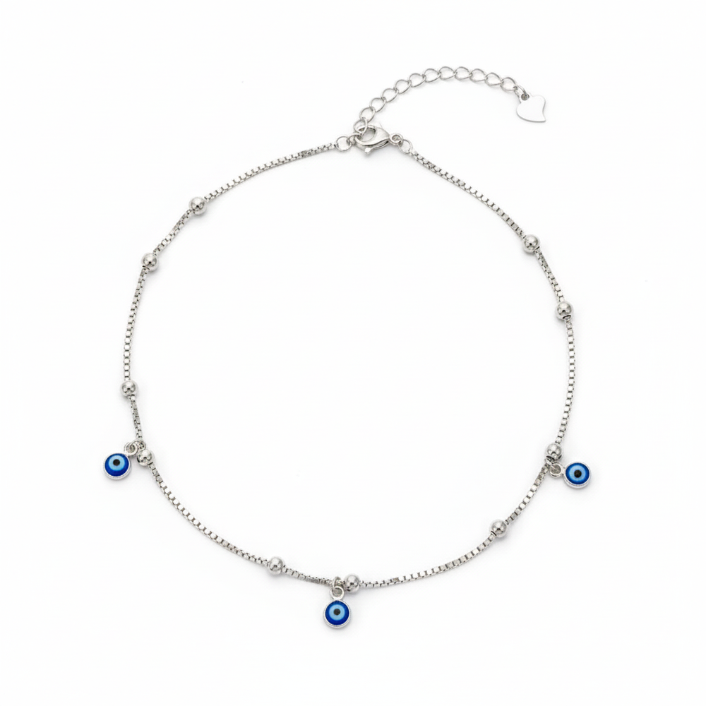 This captivating 925 Sterling Silver Anklet features a delicate chain accented with small silver beads, clear cubic zirconia (CZ) stones, and three vibrant Evil Eye charms. A symbolic piece of protection, it is secured with an adjustable lock for a perfect fit.The delicate design layers beautifully with other jewelry and enhances your look whether you're wearing heels, sandals, or barefoot.