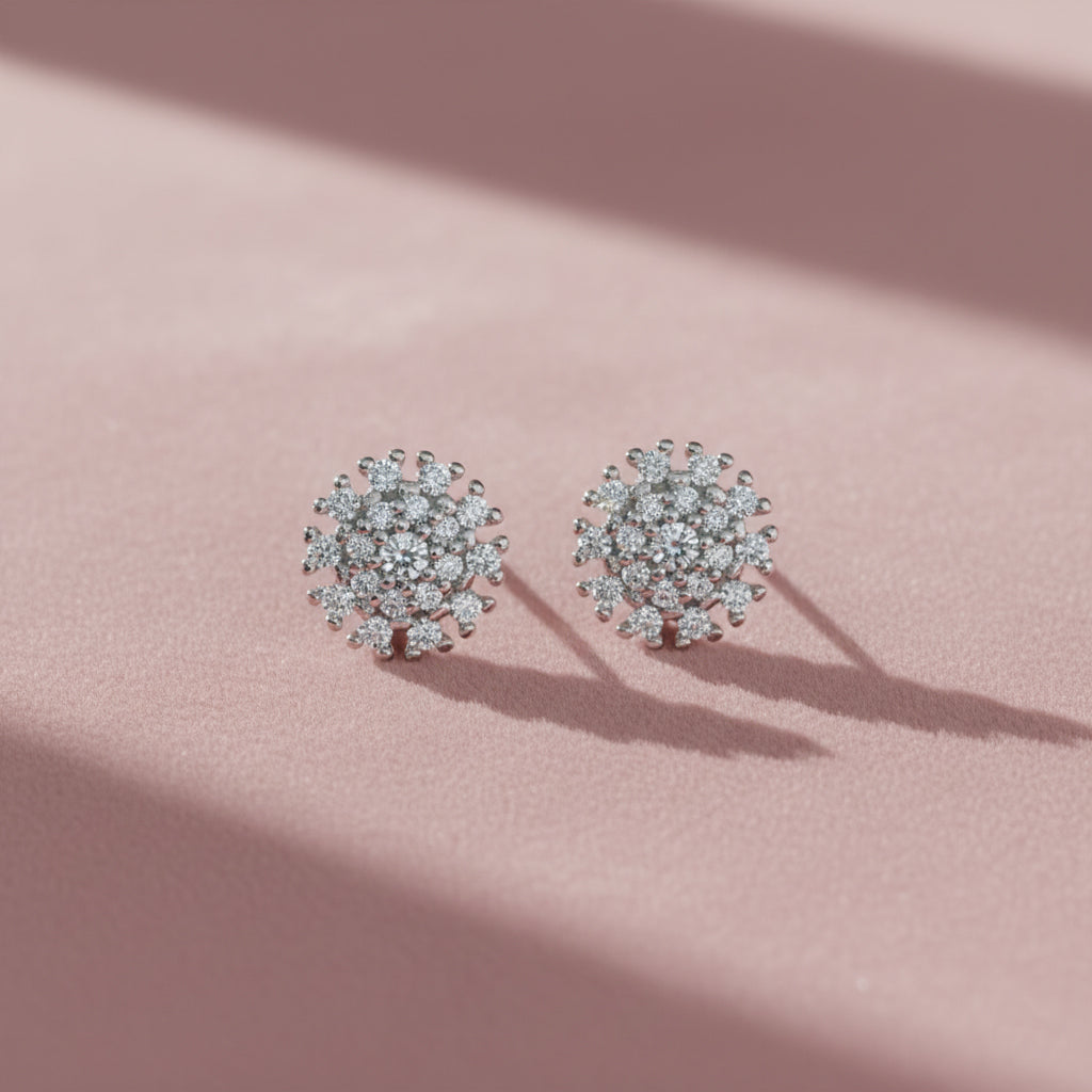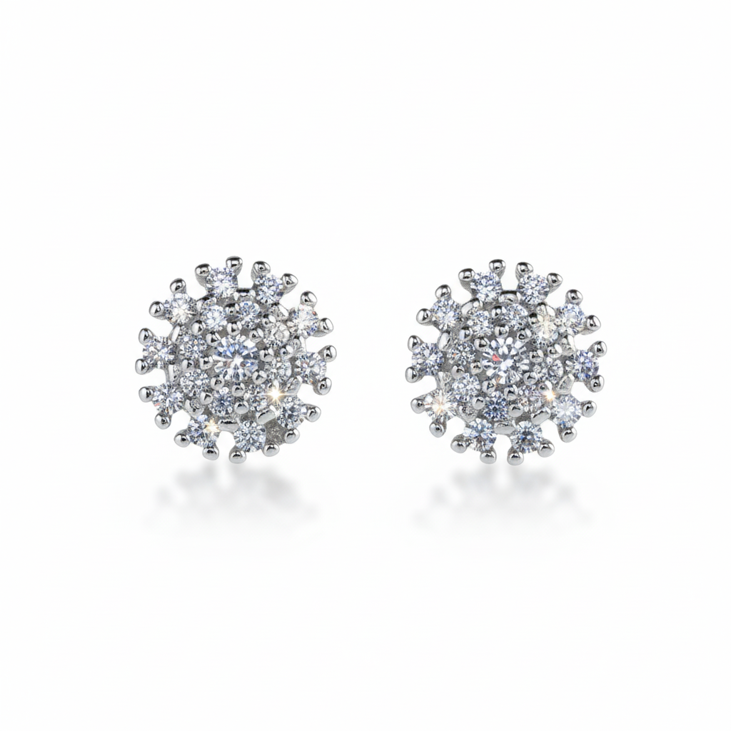 Capture the brilliance of winter with this striking Snowflake Cluster Necklace Set. The stud earrings feature a magnificent cluster of brilliant-cut cubic zirconia stones radiating outward from a central stone, mimicking a dazzling snowflake or starburst. The necklace continues this theme with multiple fixed cluster pendants spaced evenly along the chain, offering continuous sparkle and a sophisticated, charming look.