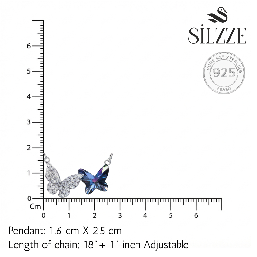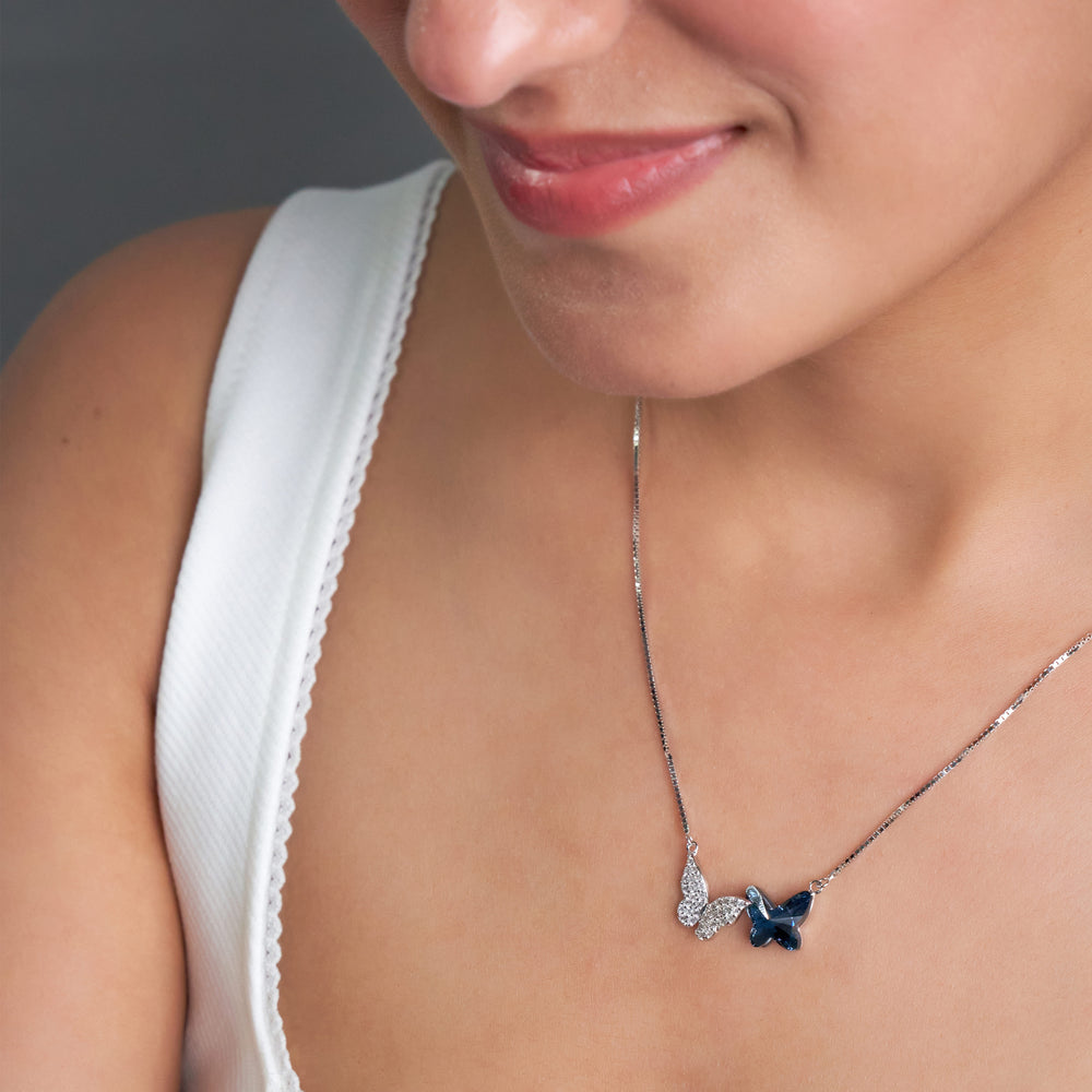 Celebrate transformation and beauty with this exquisite Dual Butterfly necklace. Suspended from a brilliant silver-toned Box Chain, the pendant features two butterflies fluttering side-by-side in perfect harmony. Crafted in 925 Sterling Silver, this necklace provides a durable structure and a radiant, lasting finish. The combination of brilliant white sparkle and deep, mysterious crystal makes this piece a unique and sophisticated accessory, perfect for adding an element of dynamic elegance to any look.