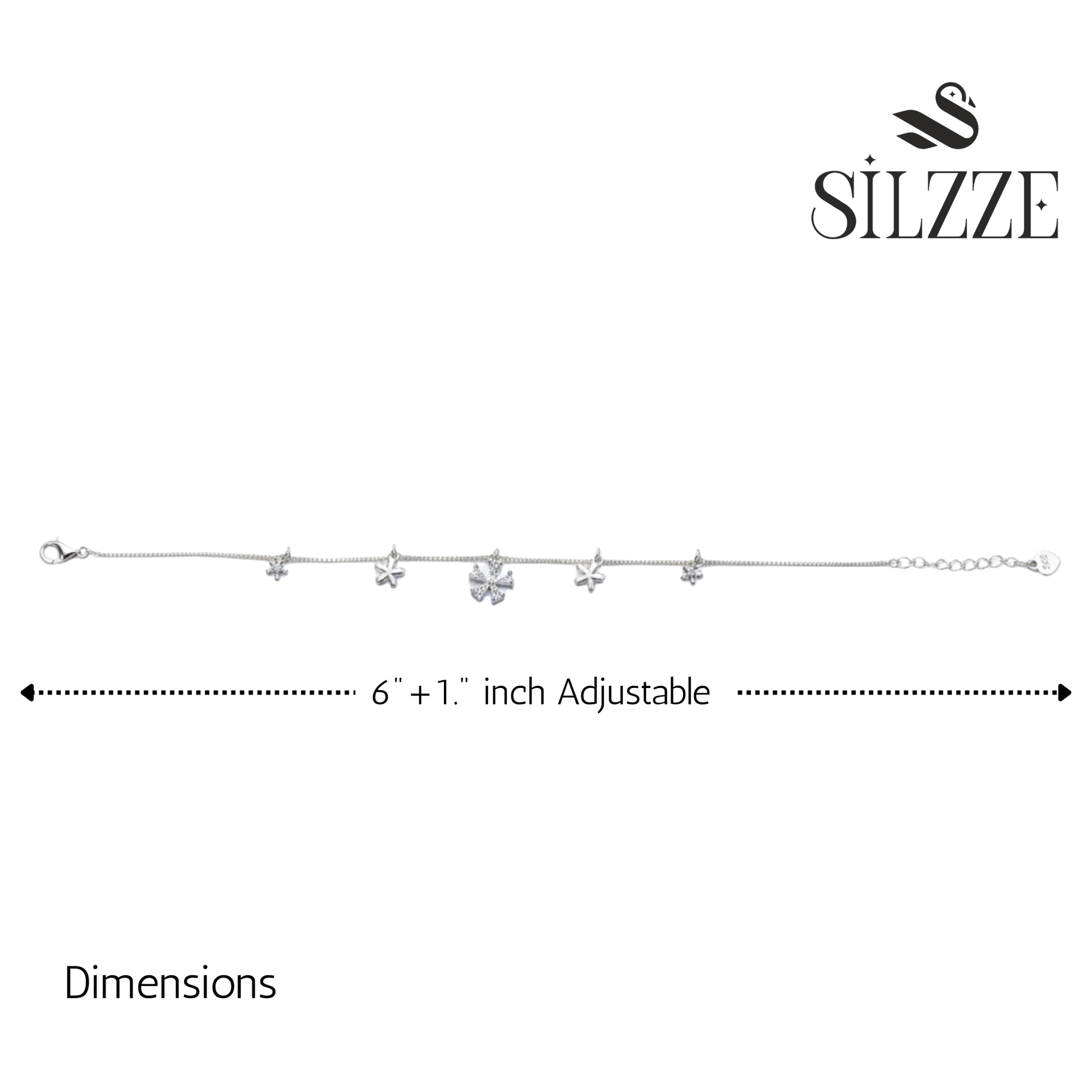 Our whimsical 925 Sterling Silver Bracelet features a box chain adorned with small cute polished silver flower charms and centered by a larger, brilliant cubic zirconia flower pendant. This piece combines modern sparkle with delicate nature-inspired elements.The dangling floral charms create lovely movement and catch the light beautifully, adding a playful and refined shimmer to the wrist. This adjustable bracelet is perfect for adding a touch of subtle, feminine charm, making it a beautiful gift or a delightful addition to your everyday layered look.