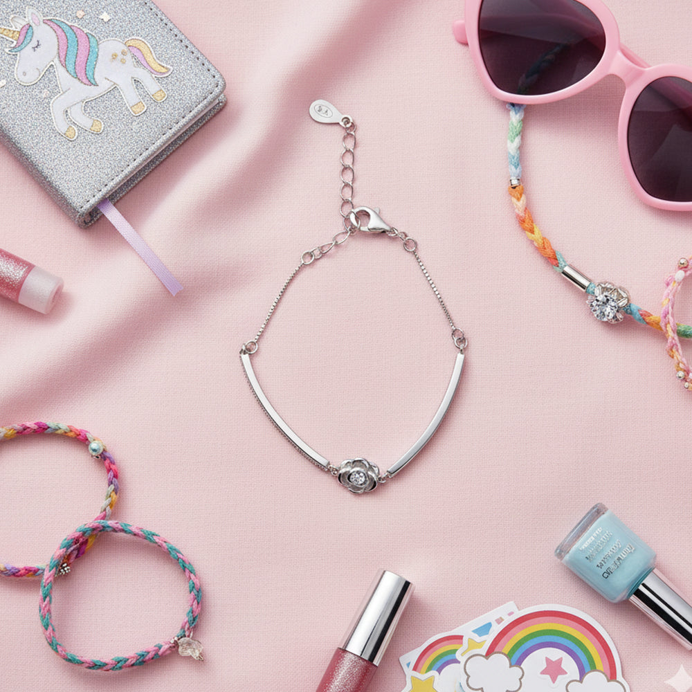 This delicate bracelet is designed for children aged 10-12 years. This enchanting Rose Flower bracelet adds a touch of feminine elegance to any child's outfit. Crafted in 925 Sterling Silver, this piece features a graceful V-shaped bar, delicately embedded with tiny cubic zirconia stones for a subtle shimmer. The centerpiece is a lovely, sculpted rose with a dazzling central crystal. An adjustable chain ensures a comfortable and secure fit for children.