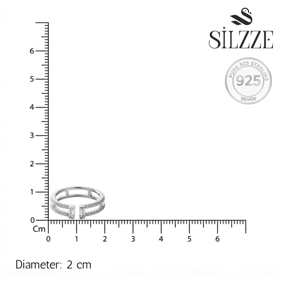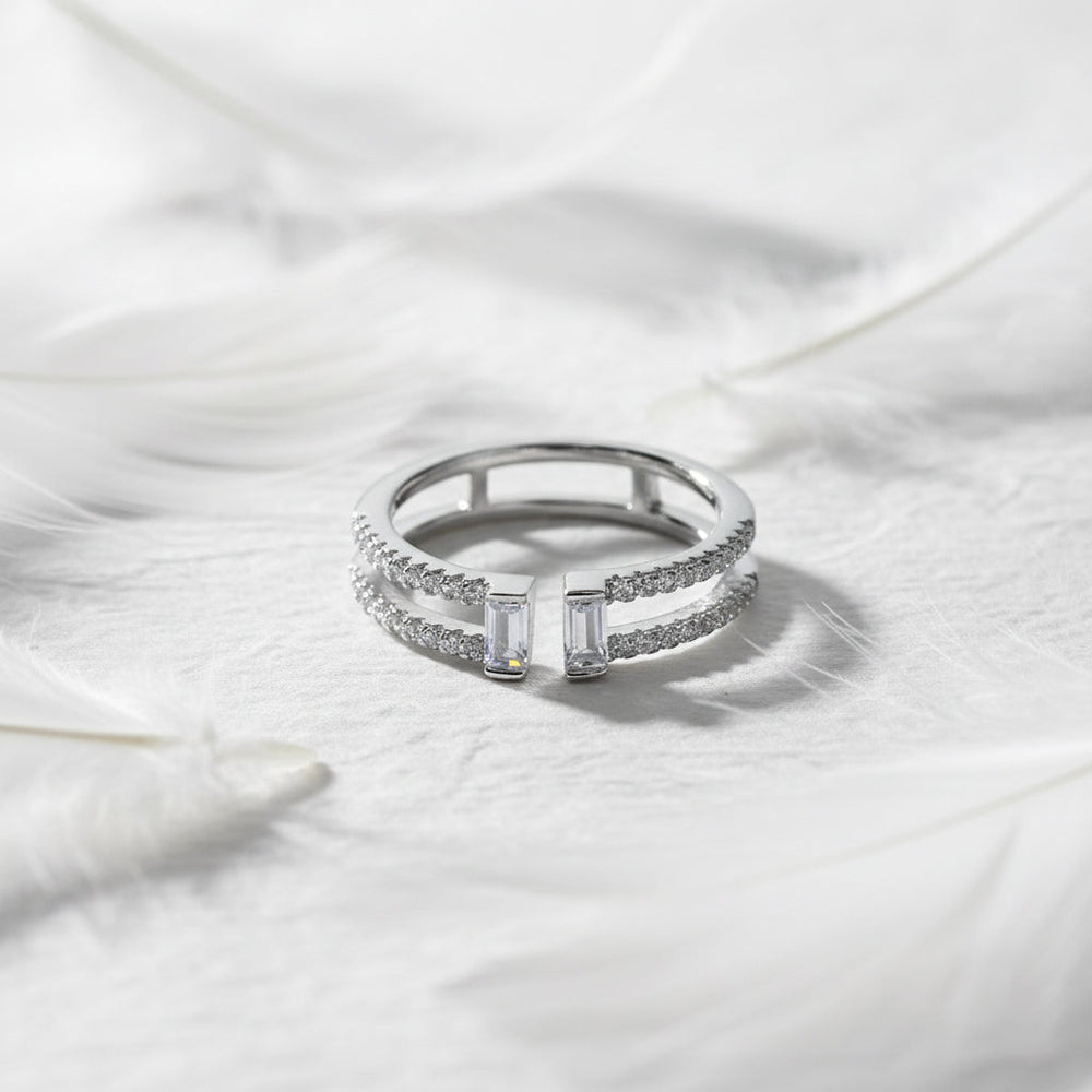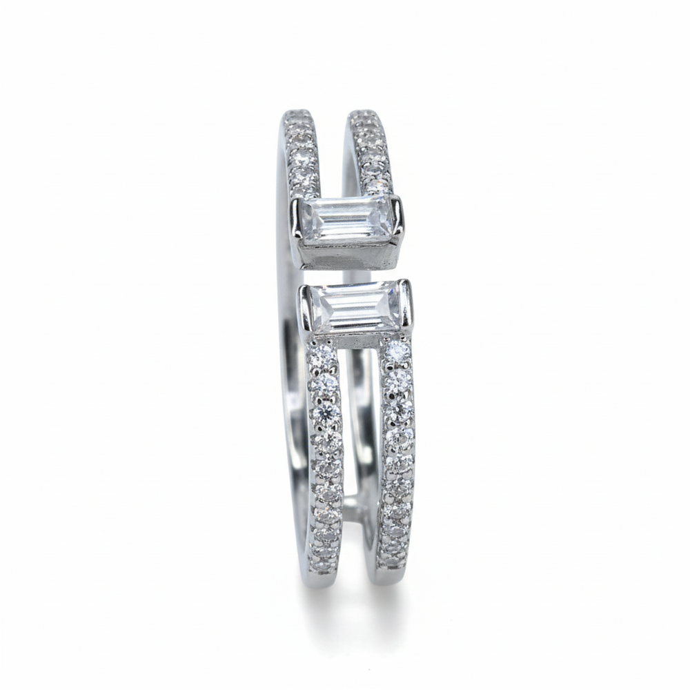 The design features two distinct bands connected at the back that gracefully split, capped by two sparkling baguette stones. The micro-pave detailing ensures maximum brilliance, catching the light with every movement. Perfect for Daily wear.