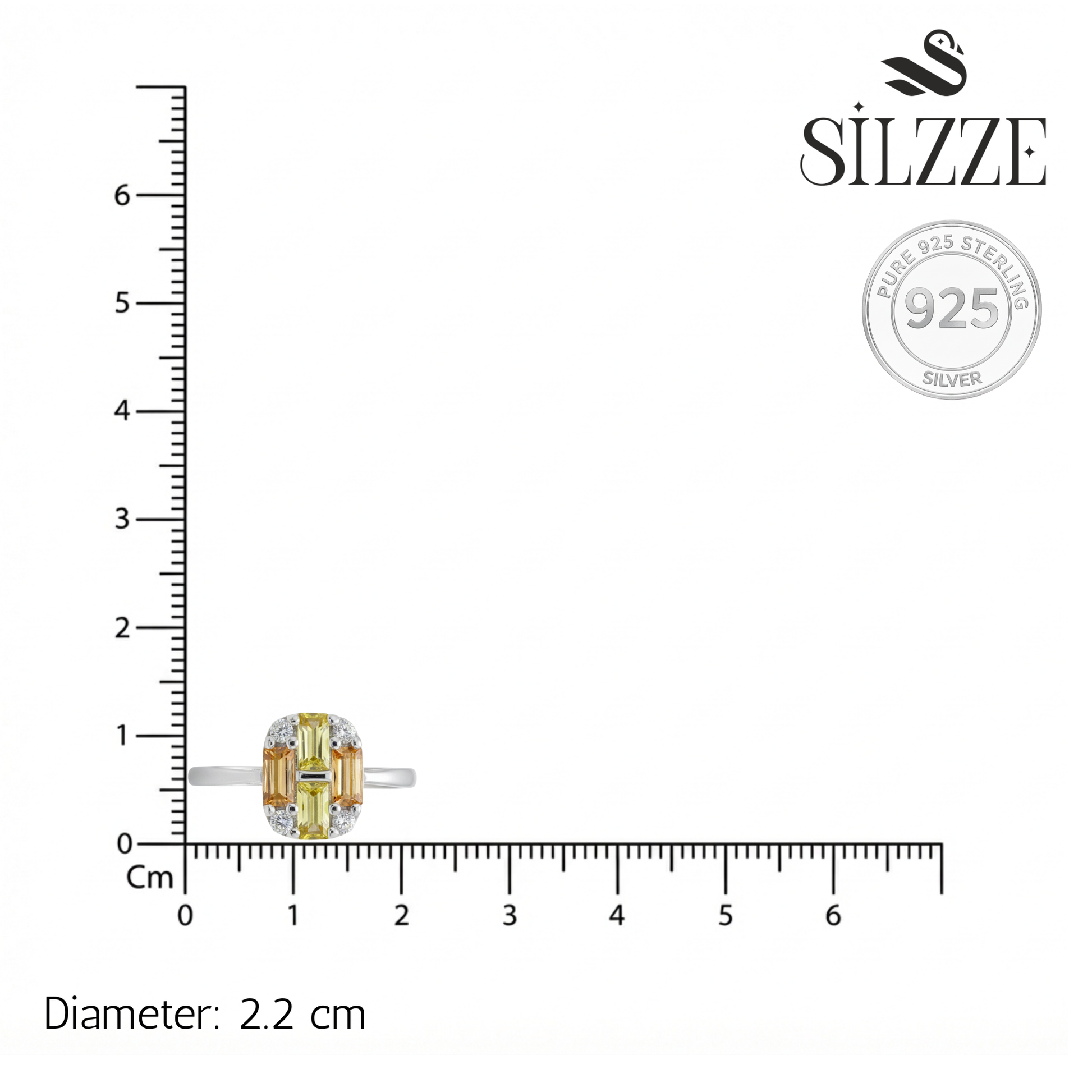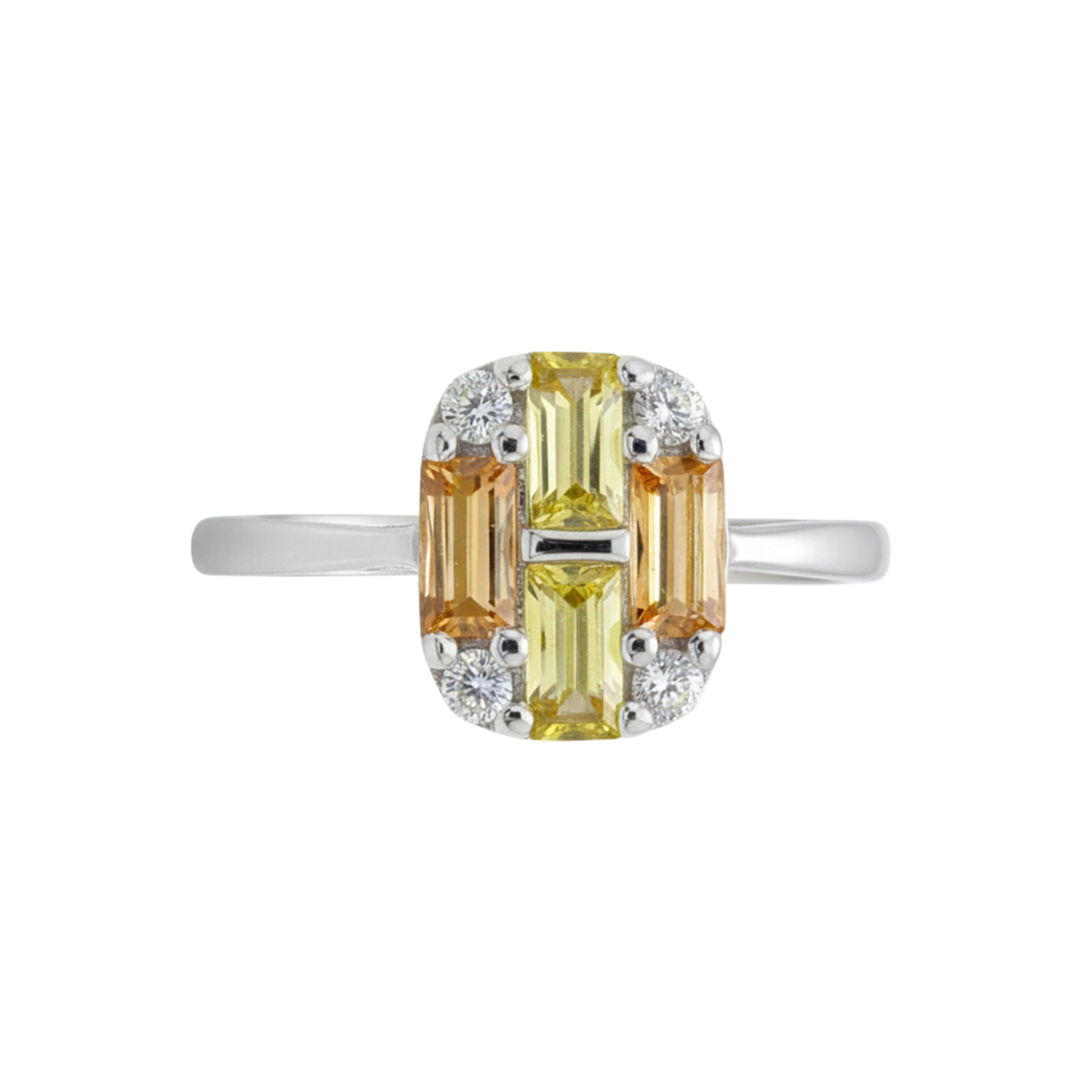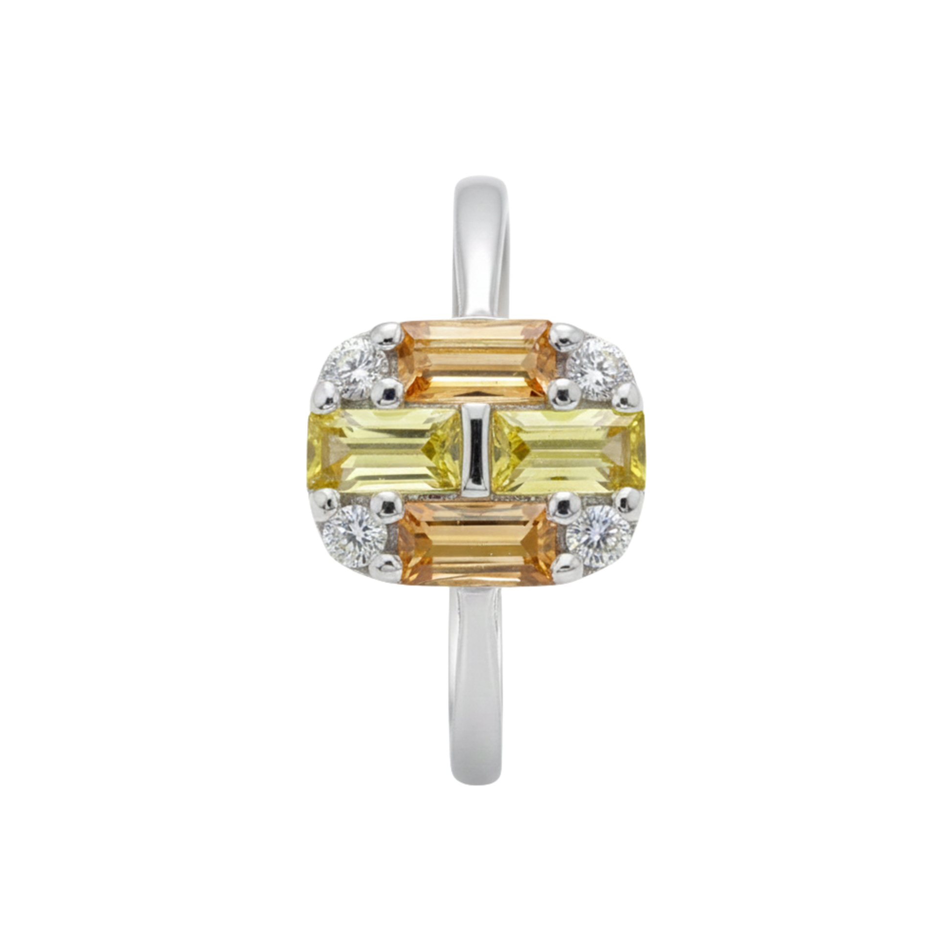 Elevate your jewelry collection with this vibrant statement piece, featuring a warm palette of yellow and amber-toned baguette-cut accents. The geometric arrangement is framed by sparkling brilliant-cut stones at each corner, creating a modern mosaic look that catches the light beautifully. Crafted in 925 sterling silver, this ring offers a high-shine finish that perfectly balances its bold, architectural design.