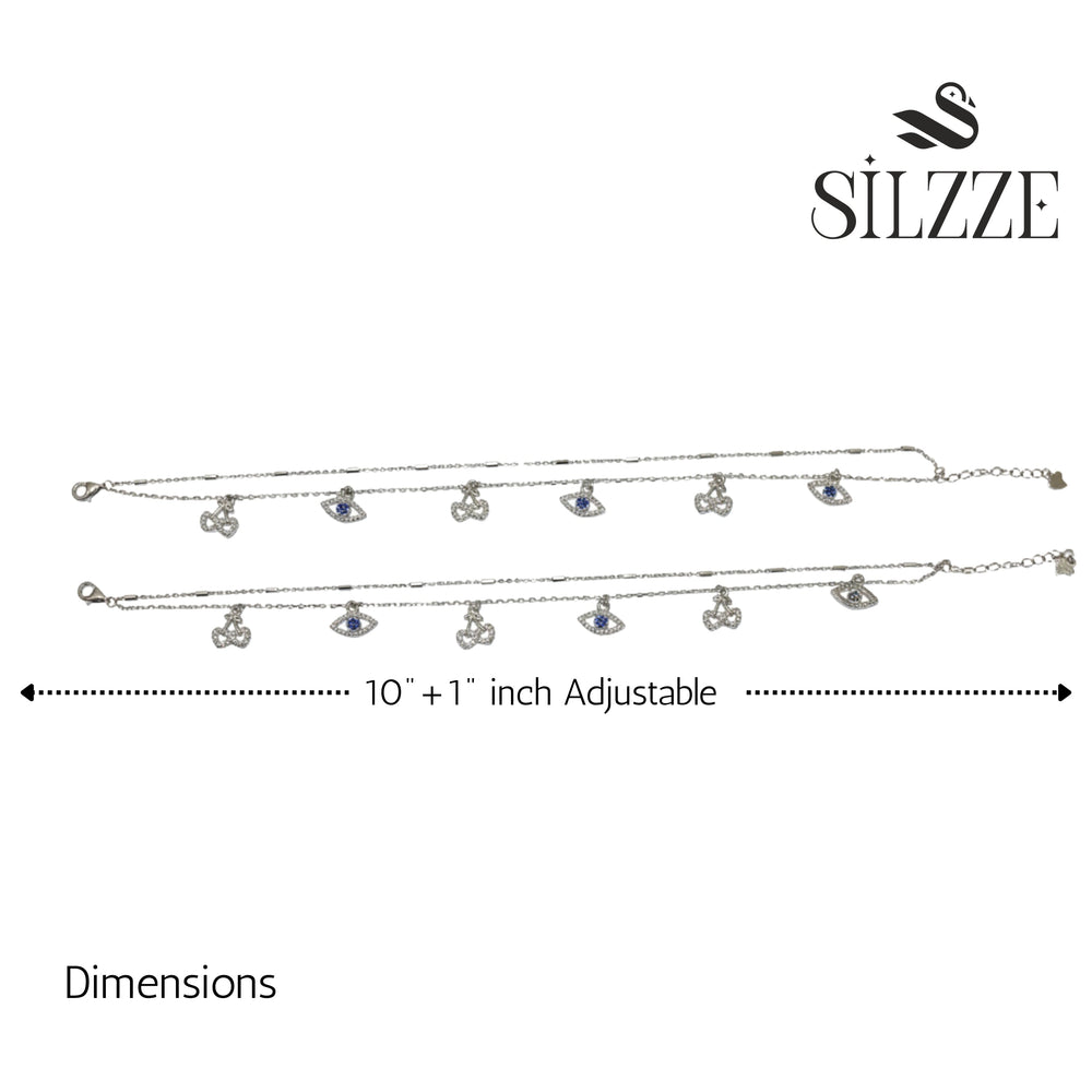 Crafted from high-quality 925 Sterling Silver, The design features two delicate chains, one slightly longer than the other, creating a naturally beautiful layered drape. The charms include cheerful, pave set cherry and striking blue and white Evil Eye charms. The anklet is secured with an adjustable spring-ring lock and extension chain, ensuring both security and customizable comfort. This layered design provides an immediate style update, pairing perfectly with light summer fabrics, sandals, or showing off a fresh pedicure.