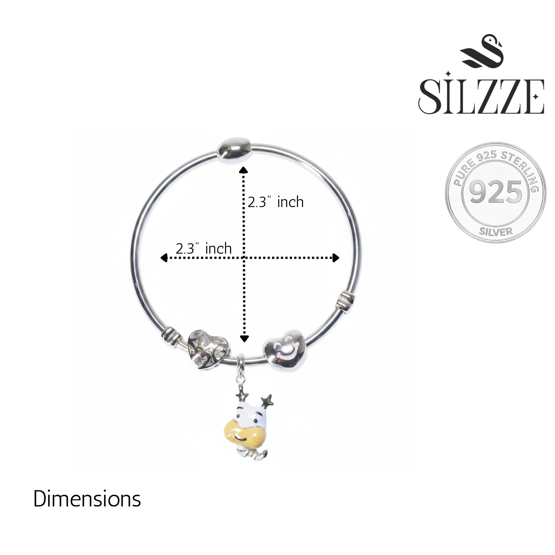 Bring a touch of whimsical fun and charm to your jewelry collection with this delightful bracelet. This piece features a smooth, polished silhouette adorned with playful bead charms, including two sweet heart charms. A standout enamel cartoon character dangles playfully from the center, adding a unique, endearing touch that’s perfect for gifting or everyday wear. Crafted in 925 Sterling Silver, this bracelet offers a beautiful luster and durable quality.