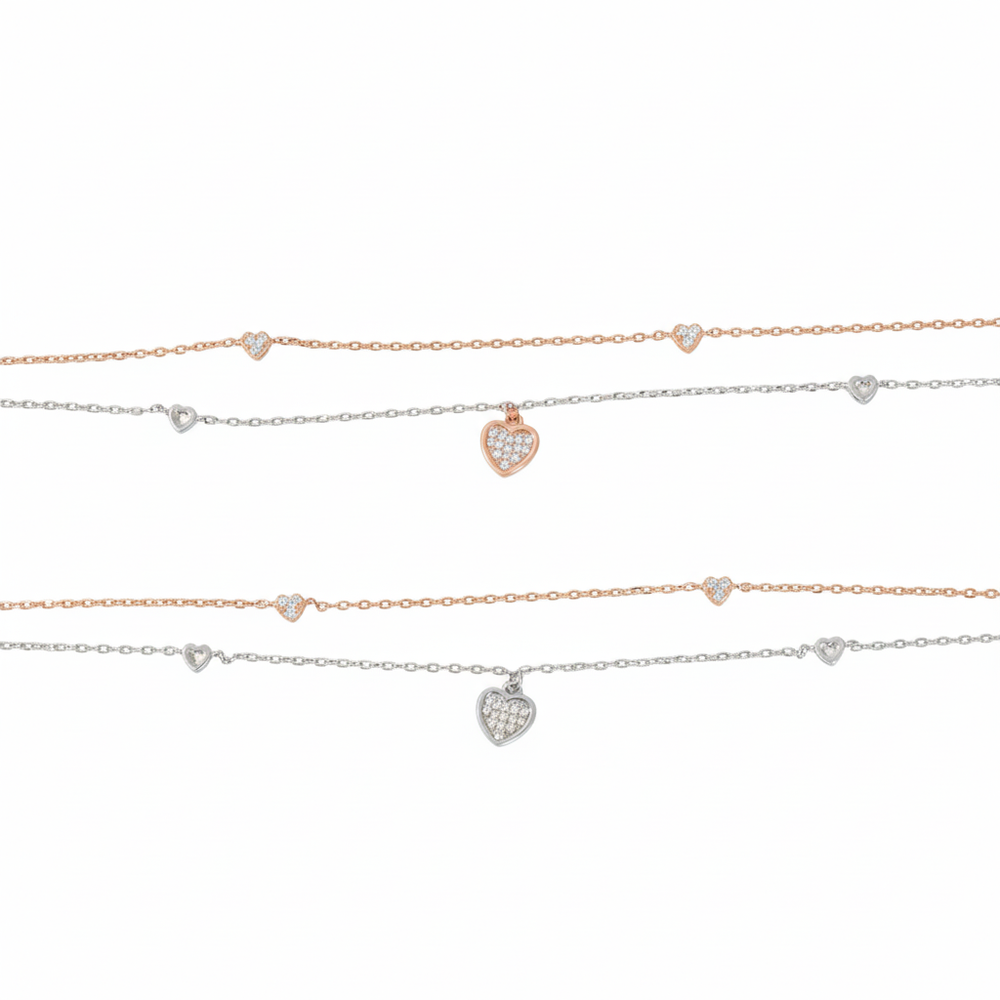 This romantic Layered Anklet Set includes two separate chains-one 925 Sterling Silver and one Rose Gold-Plated Silver-both featuring dainty satellite hearts and a shimmering central pave heart. Designed for a trendy, multimetal look, each anklet is secured with a dependable lock. The contrasting tones of silver and rose gold create a high-fashion, multi-layered look that is guaranteed to draw compliments and match all your accessories.