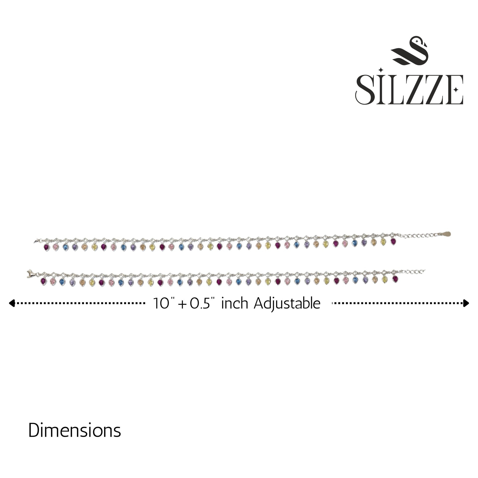 Capture the essence of joy with this eye-catching sterling silver anklet, officially stamped with the S925 mark of quality. This exquisite piece features a unique chain composed of small, glittering links accented by tiny diamond-cut stones, from which a continuous stream of vibrant, pear-shaped (teardrop) cubic zirconia stones in a rainbow of colors elegantly dangles. Its adjustable length ensures both comfort and a captivating fit. The delicate teardrop stones appear to "rain" color and sparkle around your ankle, adding an undeniably romantic and glamorous texture to your look.