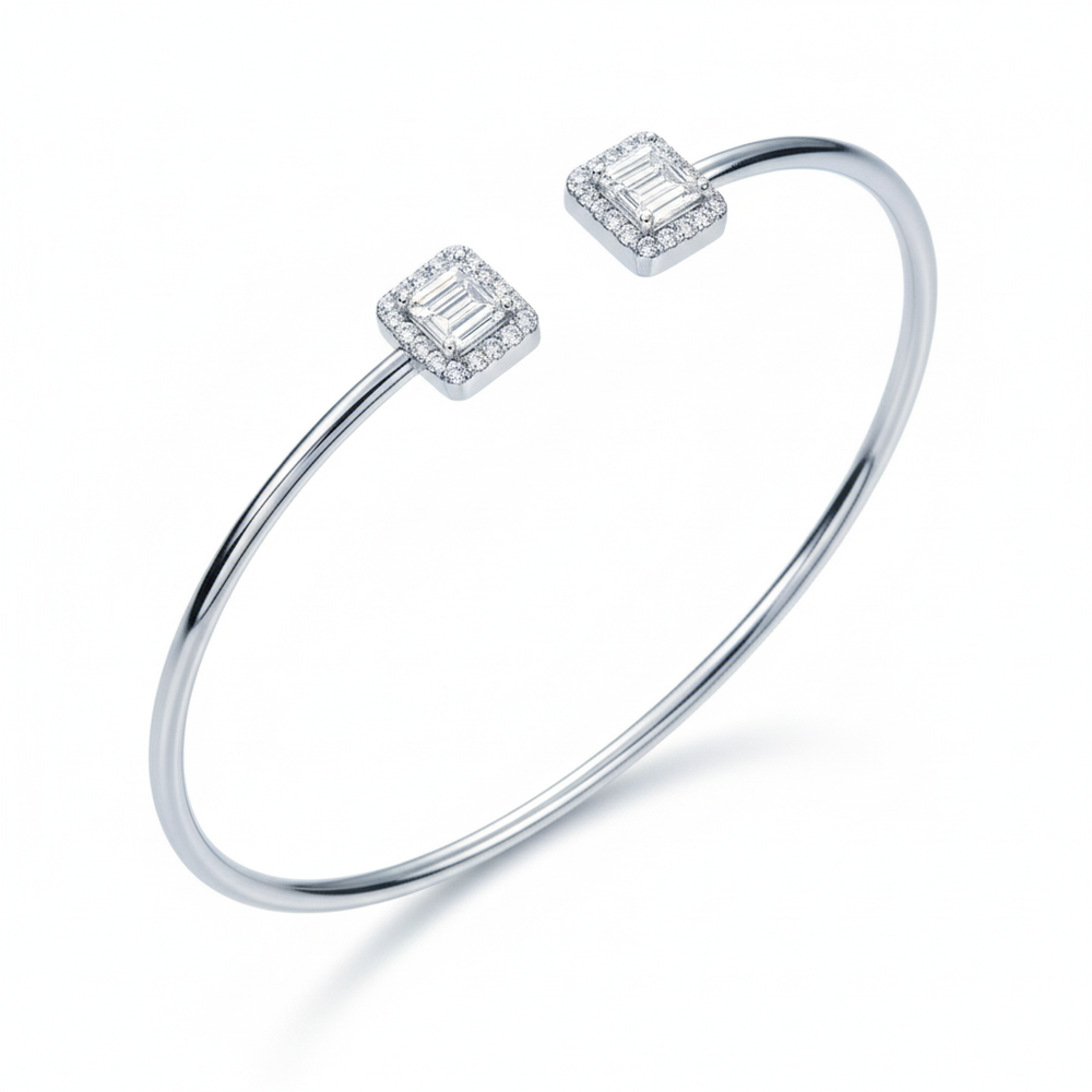 Step into the spotlight with our dazzling Regency Baguette-Cut CZ Bangle. This exquisite bracelet captures the look of fine diamond jewelry, featuring a continuous row of brilliant, vertically-set baguette-cut cubic zirconia (CZ) stones.The baguette stones are framed by delicate pave-set micro CZs, enhancing the overall sparkle and creating a captivating, continuous line of light. The sleek silver-tone metal base provides a comfortable and secure fit with its classic hinged closure.