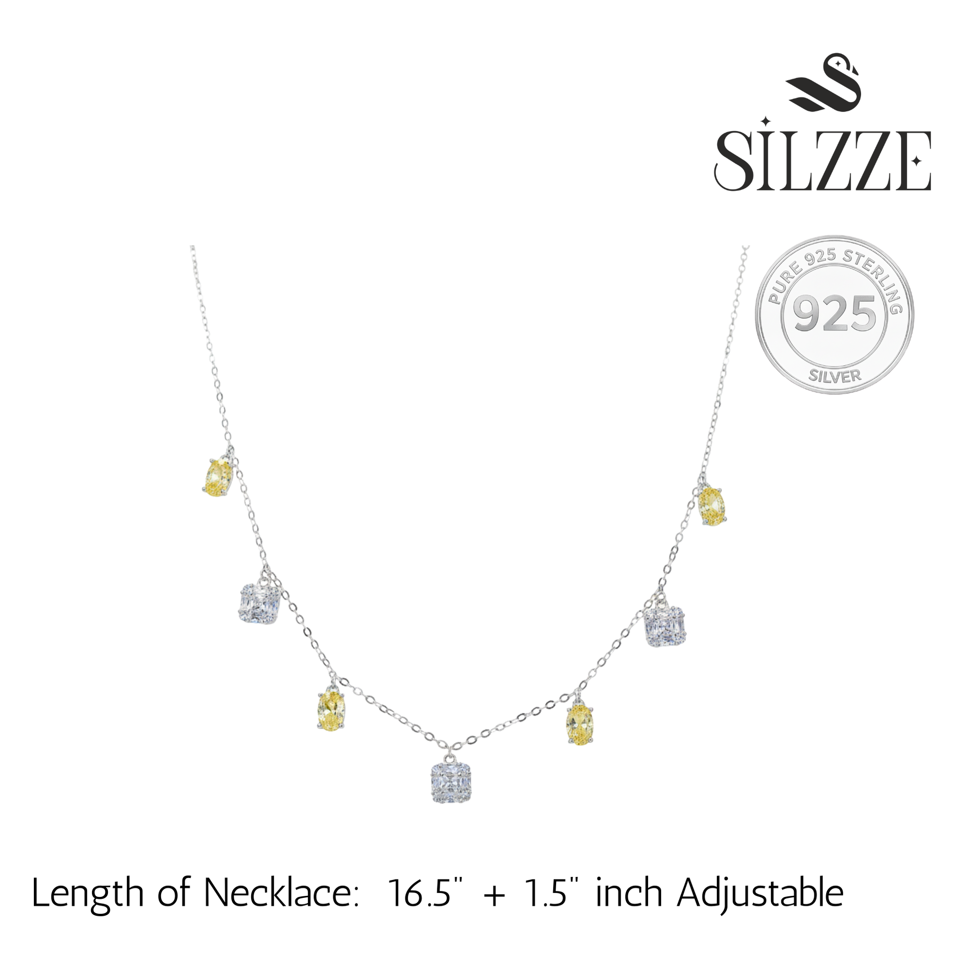 Brighten your style with this contemporary 925 Sterling Silver Station Necklace, featuring seven brilliant drop pendants in alternating cushion-cut white and oval-cut yellow cubic zirconia stones. This cute delicate piece adds a subtle yet eye-catching sparkle to your look.Designed to drape gracefully around the neckline, the spaced-out stones create a delicate garland effect that catches the light beautifully. It will look effortlessly chic , adding a fashionable touch of color and sparkle that pairs perfectly with open necklines or over simple knitwear.