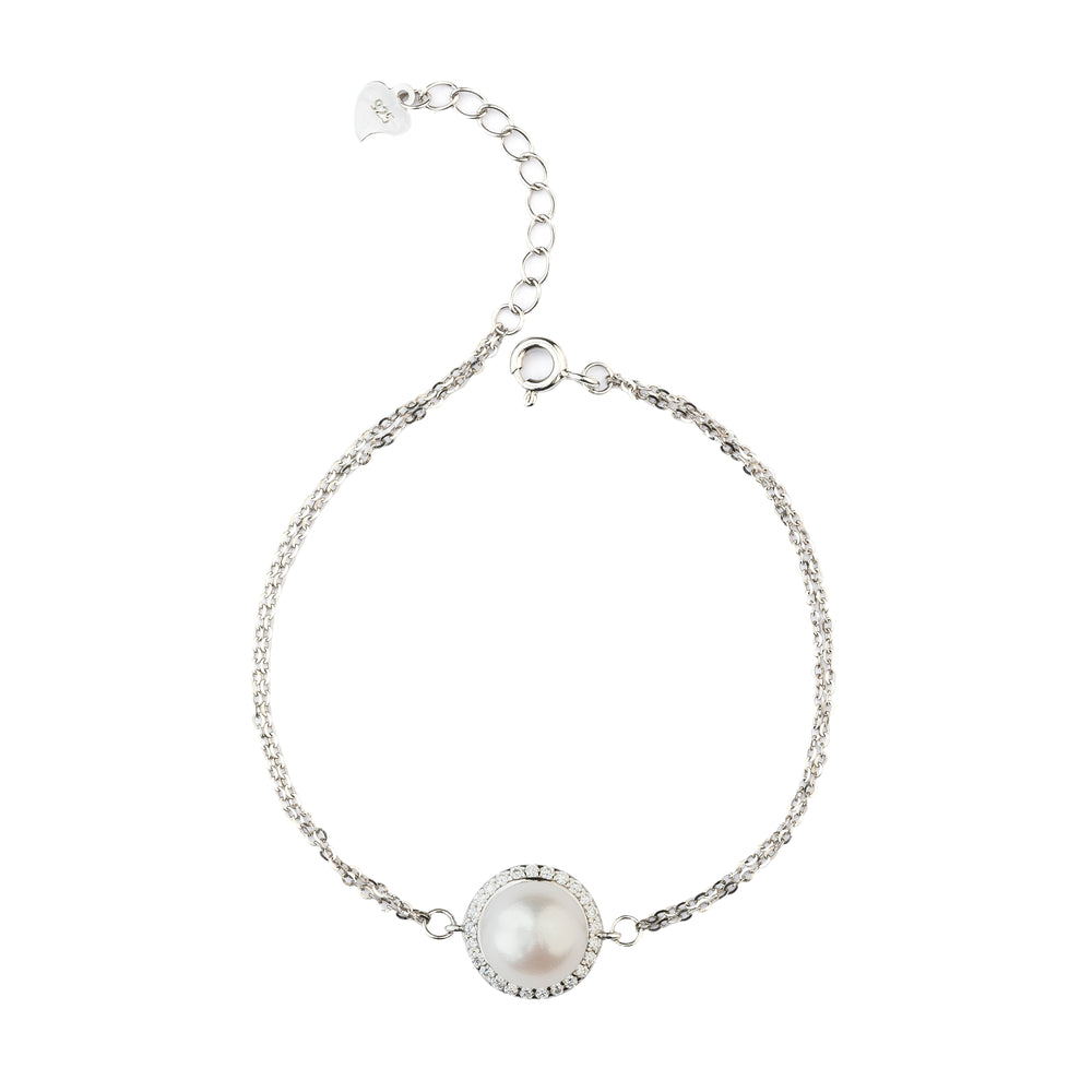 A luminous, high-luster freshwater pearl nestled within a shimmering halo cubic zirconia, this bracelet captures light from every angle Crafted in 925 sterling silver, this piece is finished with a premium rhodium plating for a lasting, tarnish-resistant shine. The adjustable chain, finished with a charming heart-shaped tag which makes sure a custom fit that remains secure and comfortable throughout the day. Exude effortless grace with this modern take on a classic treasure. The unique double-strand cable chain adds a contemporary touch of texture and sophistication to the wrist.