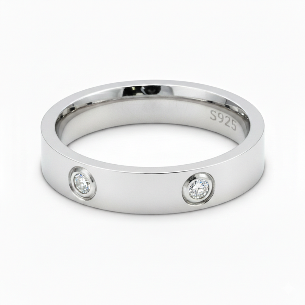 The design is characterized by the integration of two brilliant-cut cubic zirconia (CZ) accents meticulously set flush into the band. These sparkling stones are encircled by a polished silver bezel, creating a distinctive and meaningful "screw" or stud aesthetic, reminiscent of the timeless style of commitment jewelry.